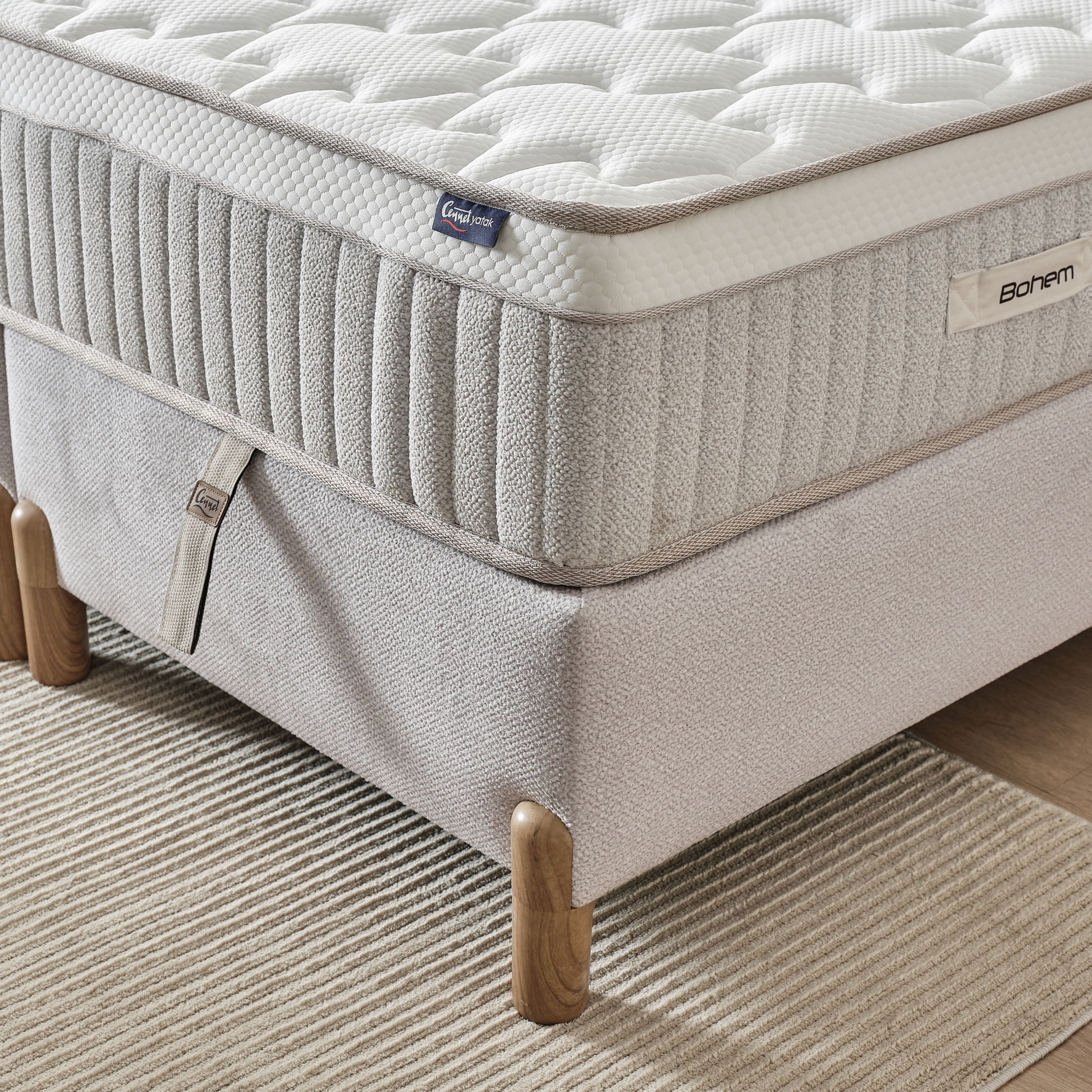 Das Bohem Boxbett vereint modernen Schlafkomfort mit durchdachter Funktionalität. Mit seiner eleganten Stoffoptik, dem gepolsterten Kopfteil und dem praktischen Stauraum bietet es alles, was man sich für ein gemütliches Schlafzimmer wünscht.