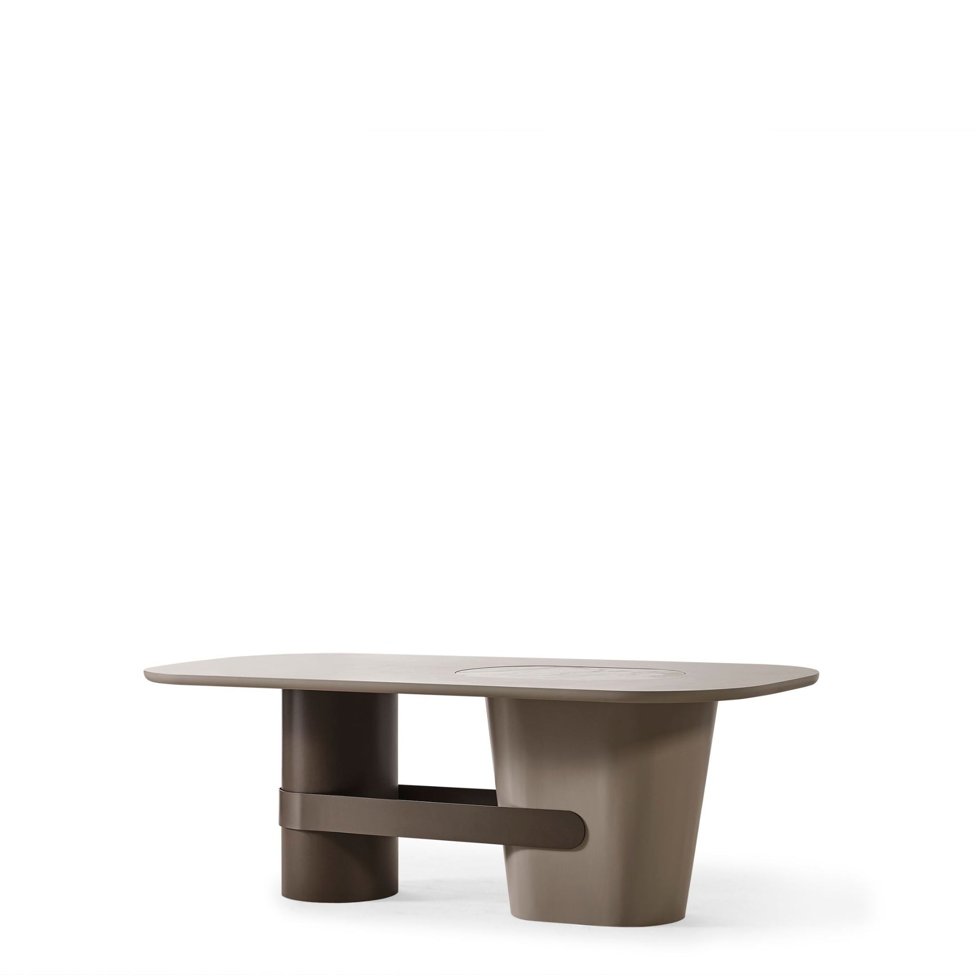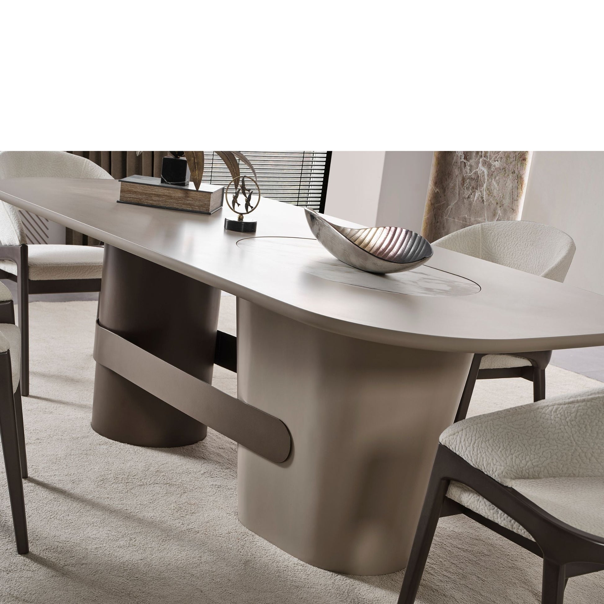 Esstisch: Ovale Tischplatte mit integriertem Marmor-Designeinsatz. Stabile, asymmetrische Fußkonstruktion mit markantem Mittelsteg für einen exklusiven Look.