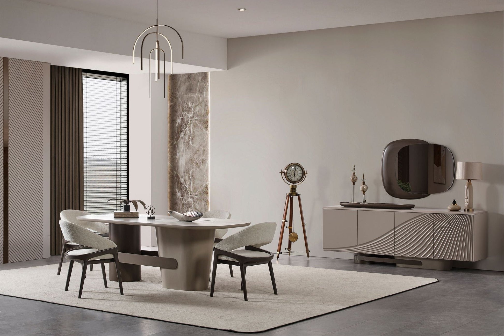 Das Latte Esszimmer-Set verbindet warmes Braun mit sanften Cremetönen und geschwungenen Formen zu einem eleganten Gesamtbild. Edle Details, hochwertige Materialien und eine harmonische Linienführung machen dieses Set zu einem stilvollen Mittelpunkt jeder Wohnung.