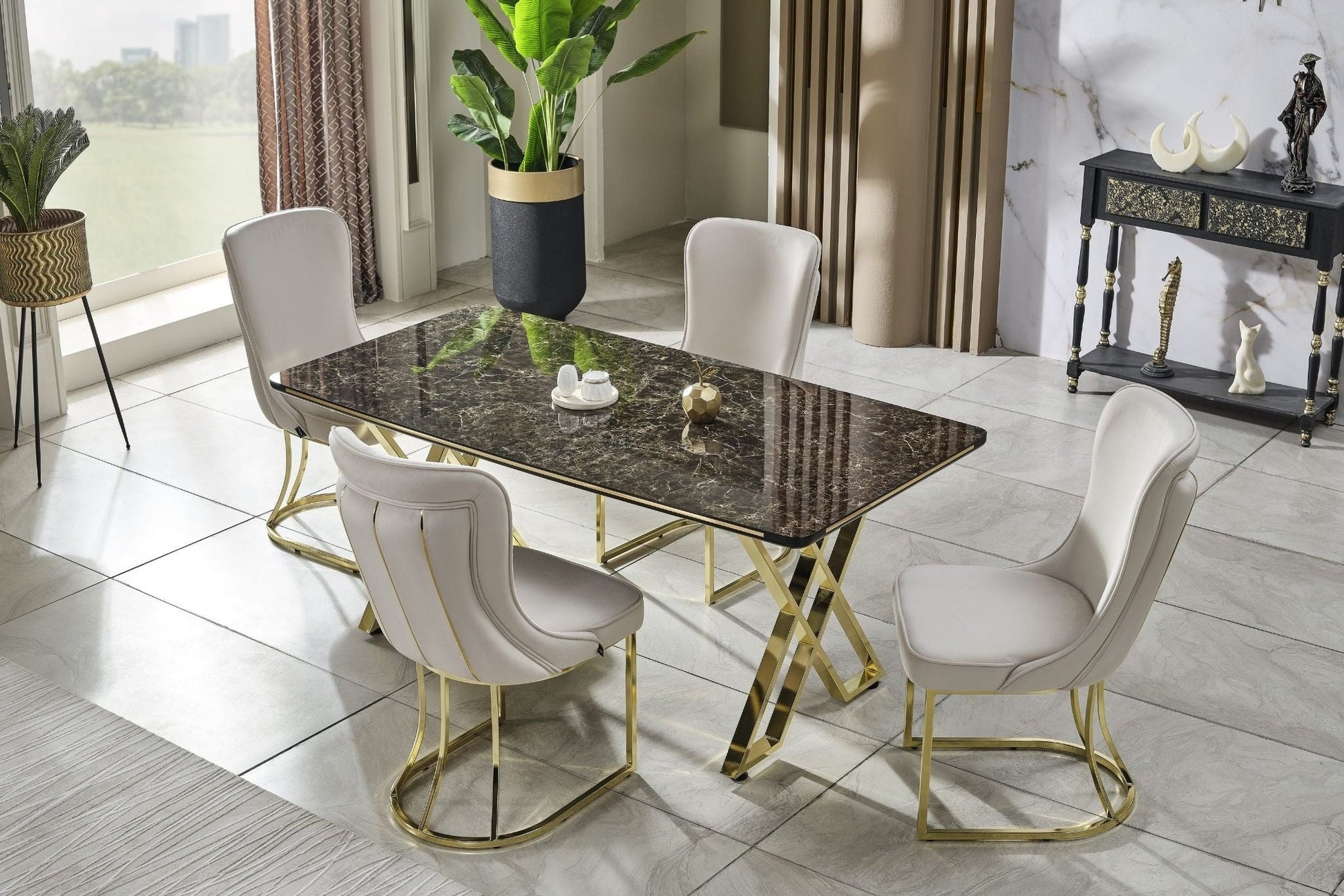Der Luna Elite Esstisch mit Tual Stühlen in Gold ist ein elegantes Gesamtset für anspruchsvolle Essbereiche – modern, hochwertig und zeitlos.