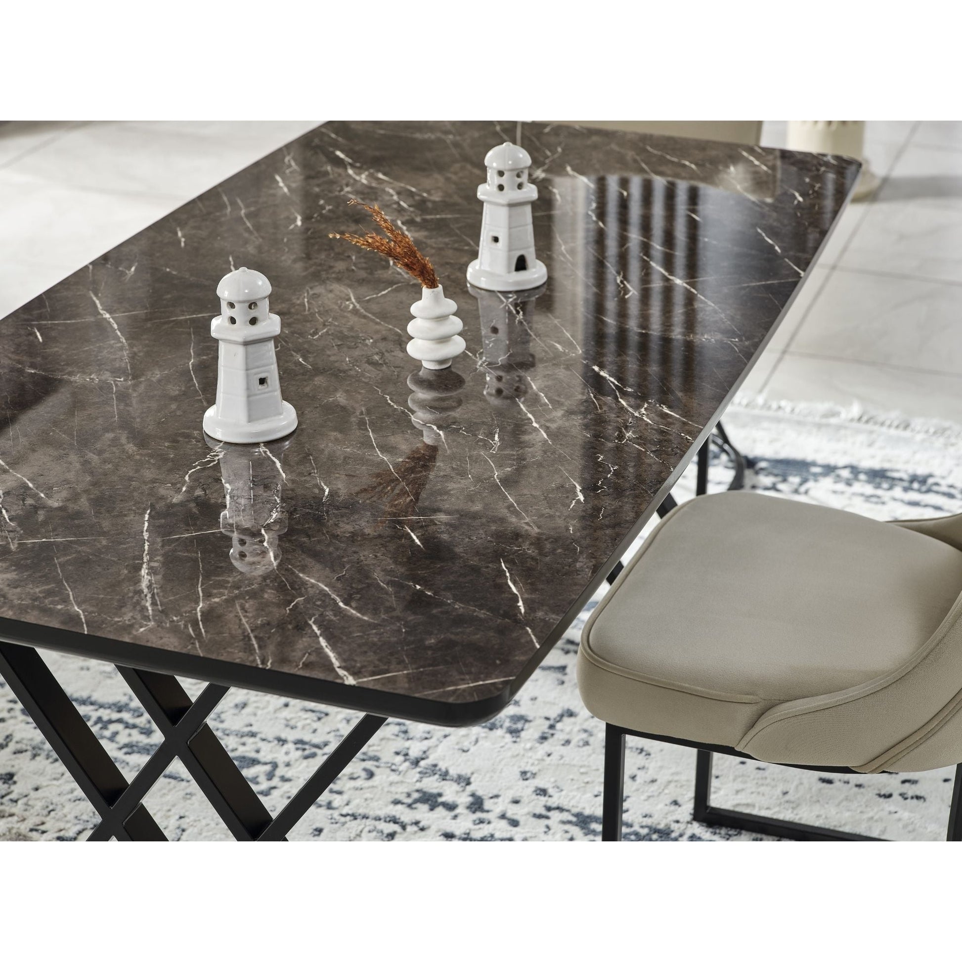 Die Tischplatte aus hochwertigem MDF-Lackpanel besticht durch ihre glatte, glänzende Oberfläche, während das stabile Metallgestell in Schwarz für eine moderne und elegante Optik sorgt.