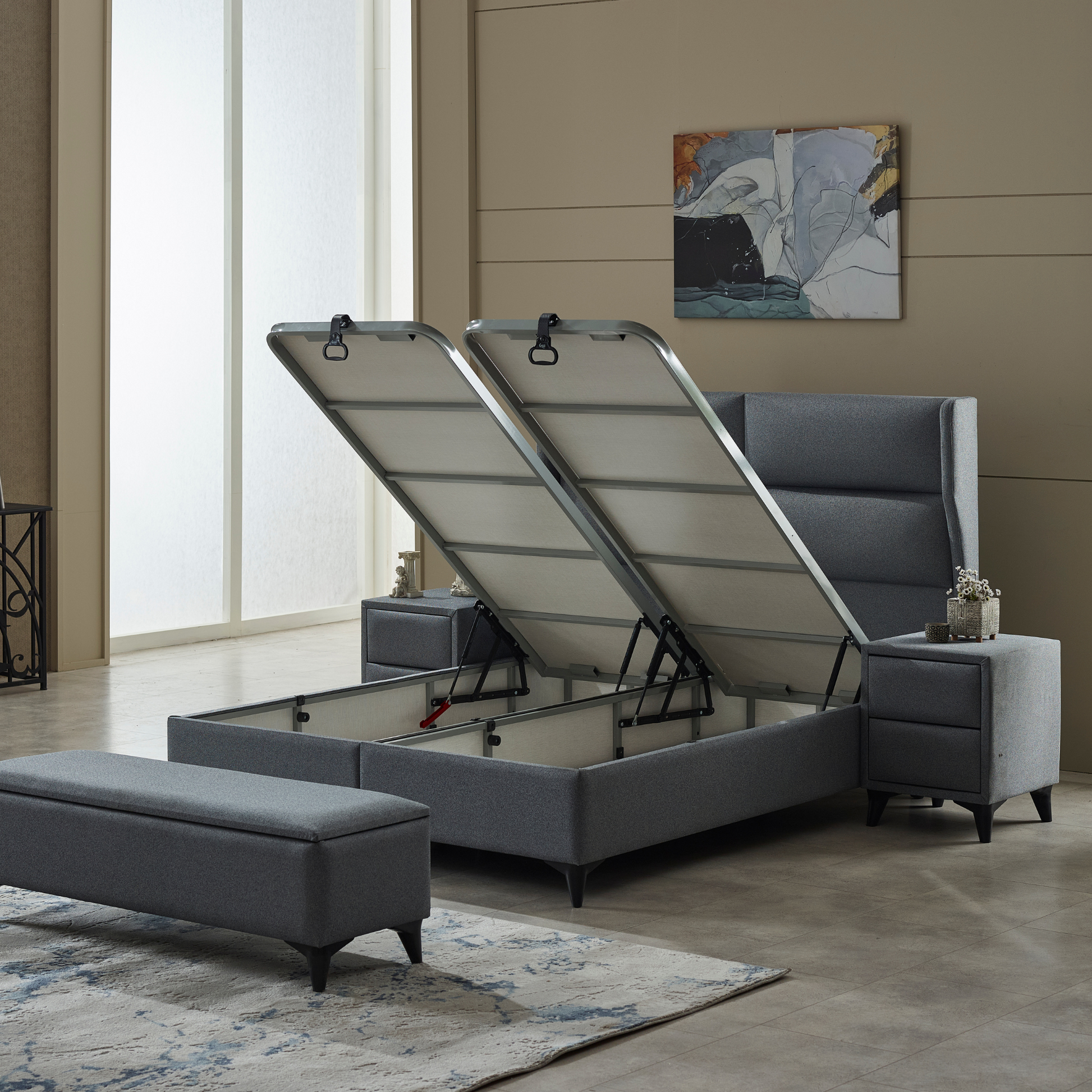 Die stabile Metallkastenkonstruktion sorgt für Langlebigkeit und Zuverlässigkeit, während der großzügige integrierte Bettkasten eine clevere Stauraumlösung bietet. Ob Bettwäsche, Kissen oder andere Gegenstände – mit dem leicht zugänglichen Stauraum bleibt Ihr Schlafzimmer stets aufgeräumt.