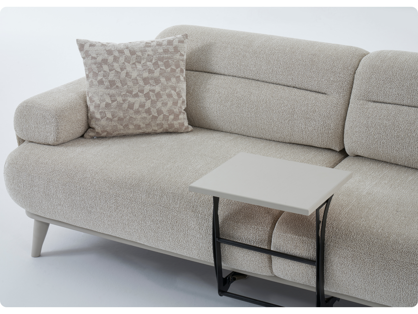 - Integrierter Ablagetisch (optional): Ein versteckter Tisch, der mit einem einfachen Mechanismus aus dem 3-Sitzer herausgezogen werden kann – ideal für Getränke, Bücher oder Snacks.
