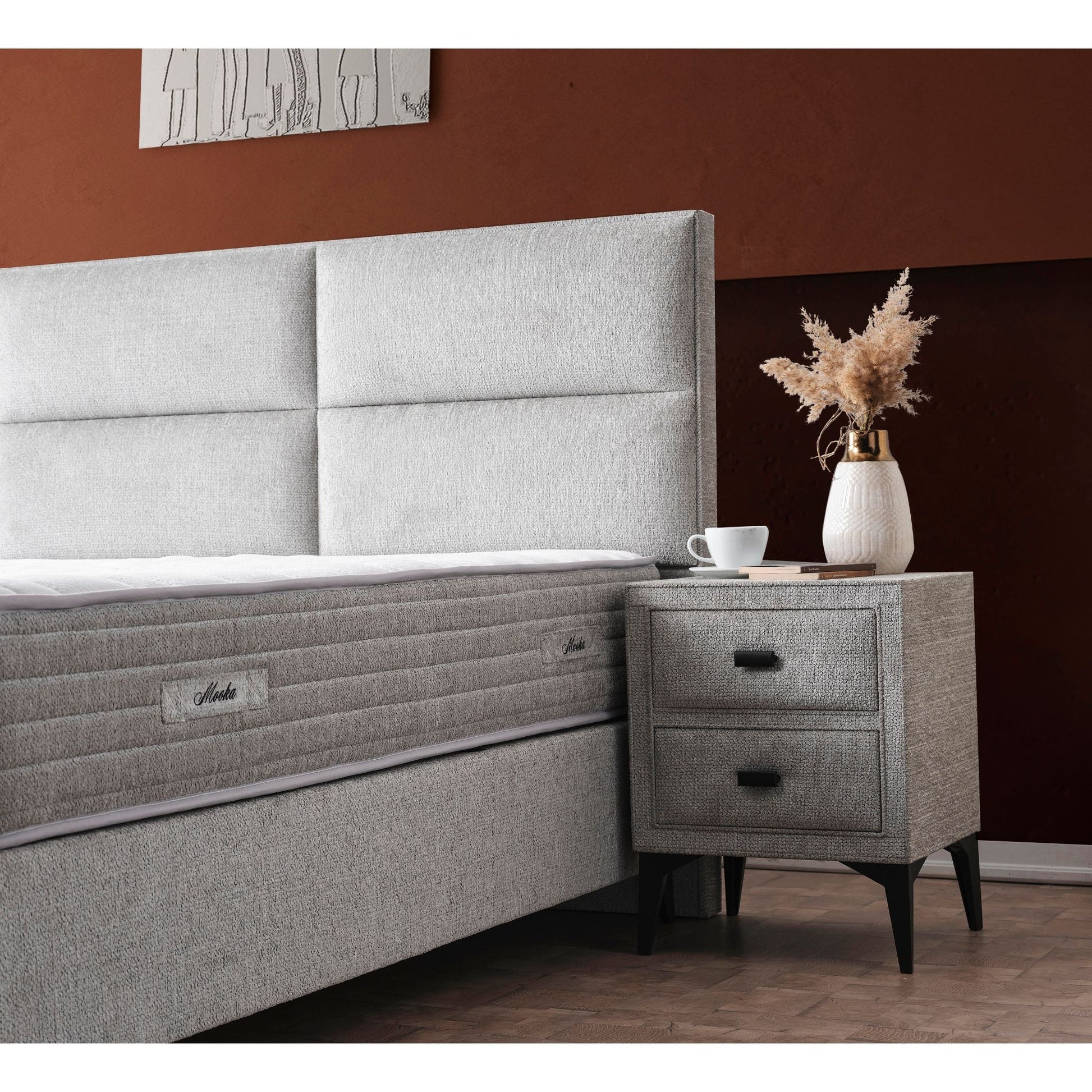 Der vollständig stoffbezogene Korpus in hellgrauer Strukturoptik sorgt für eine ruhige und hochwertige Atmosphäre, die in jedes Schlafzimmer passt.