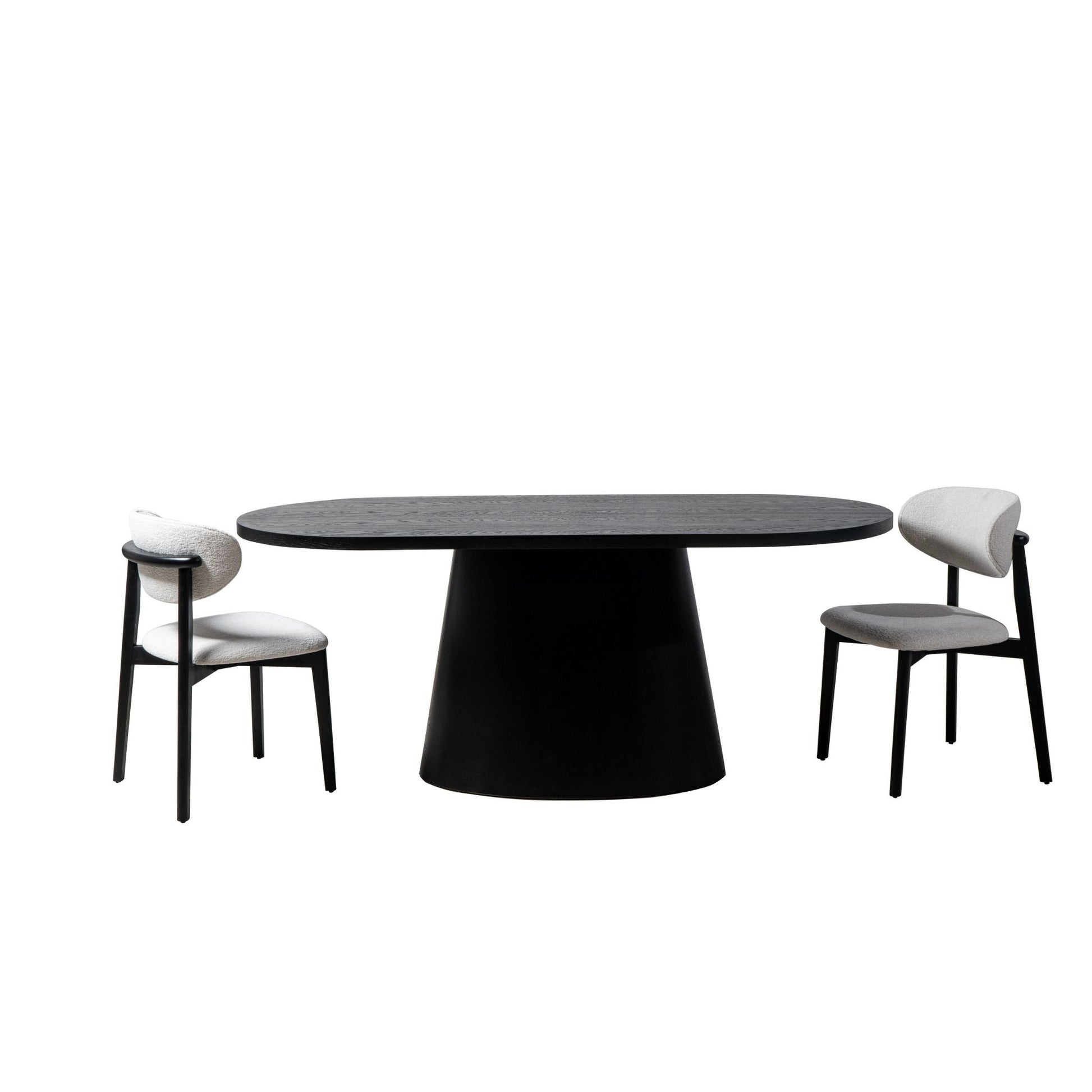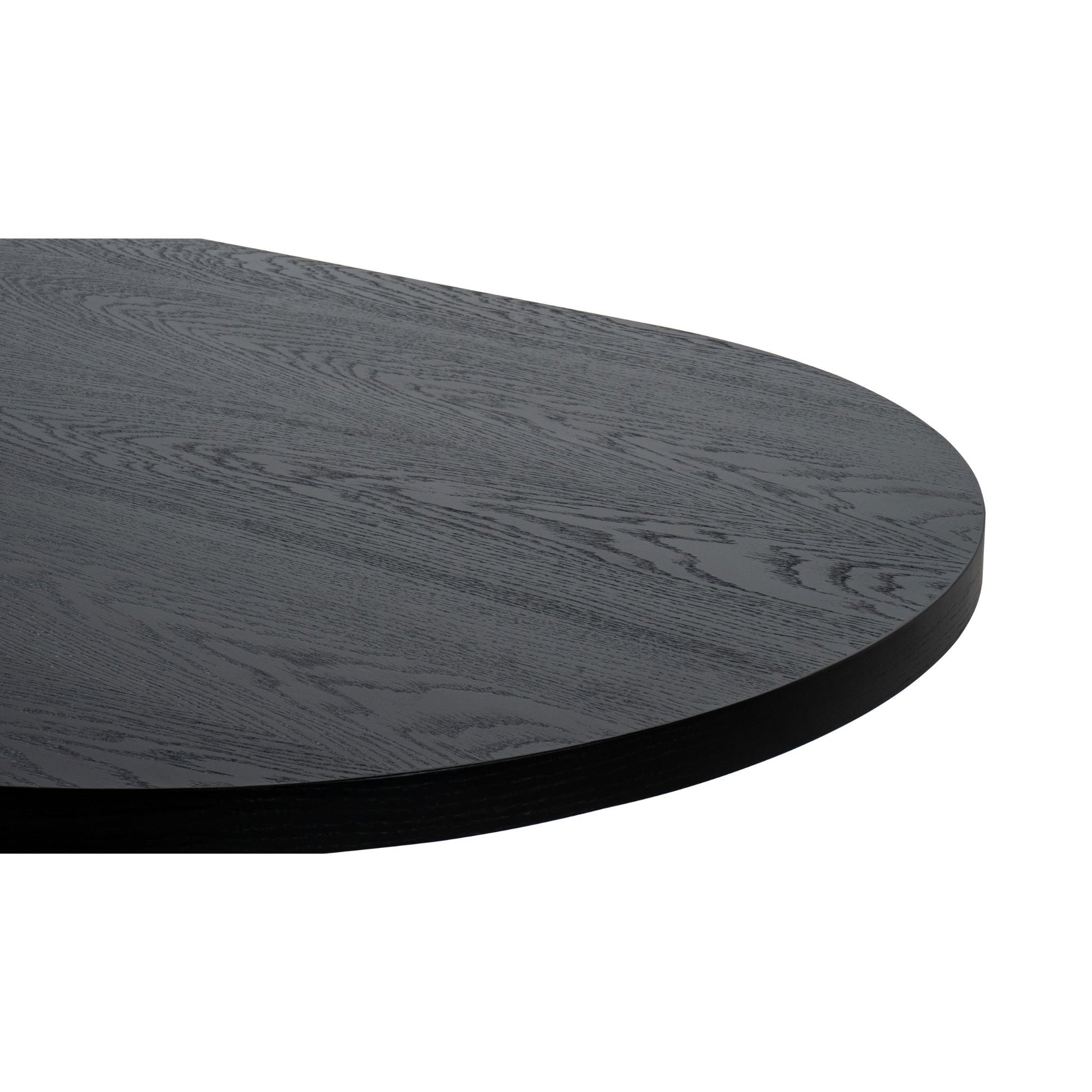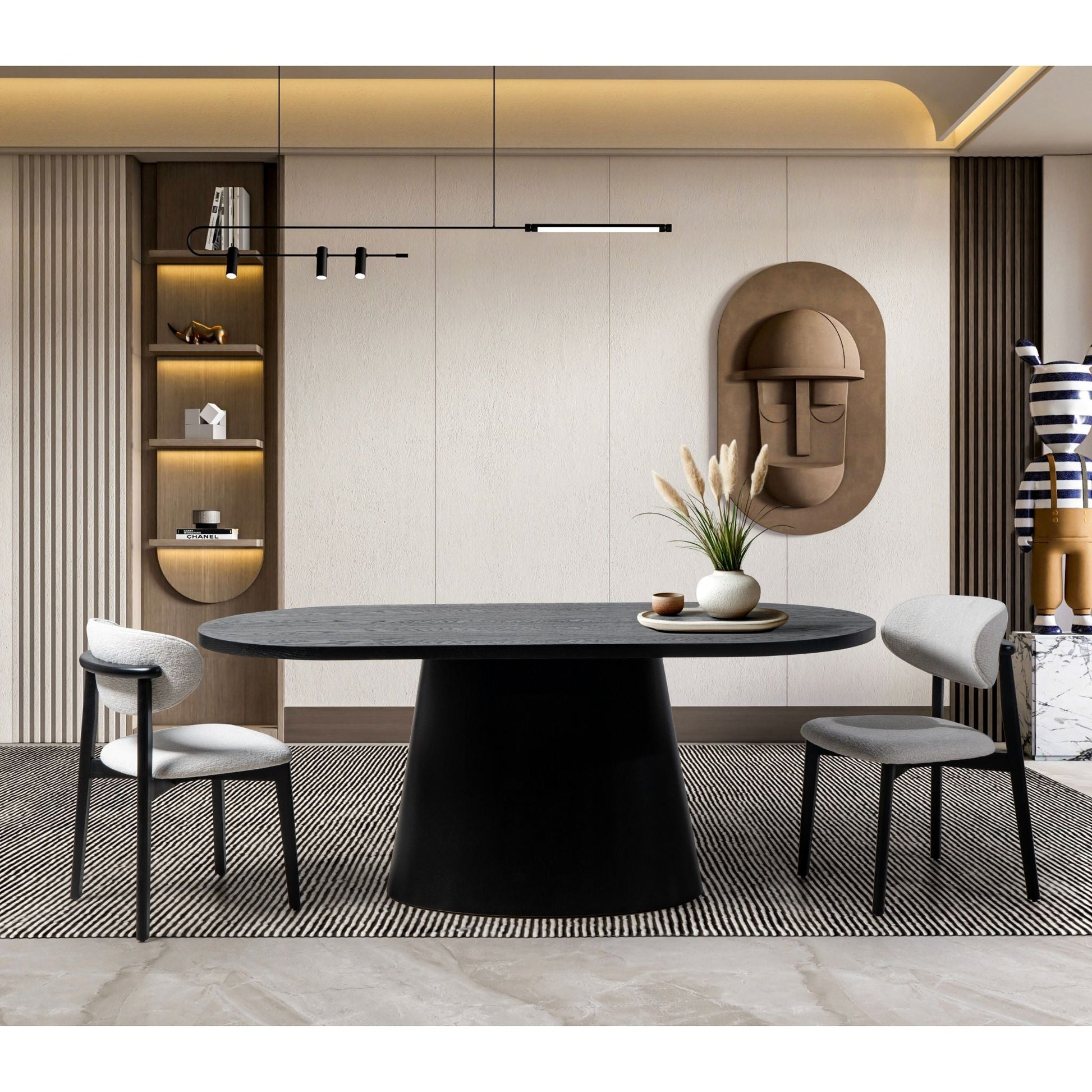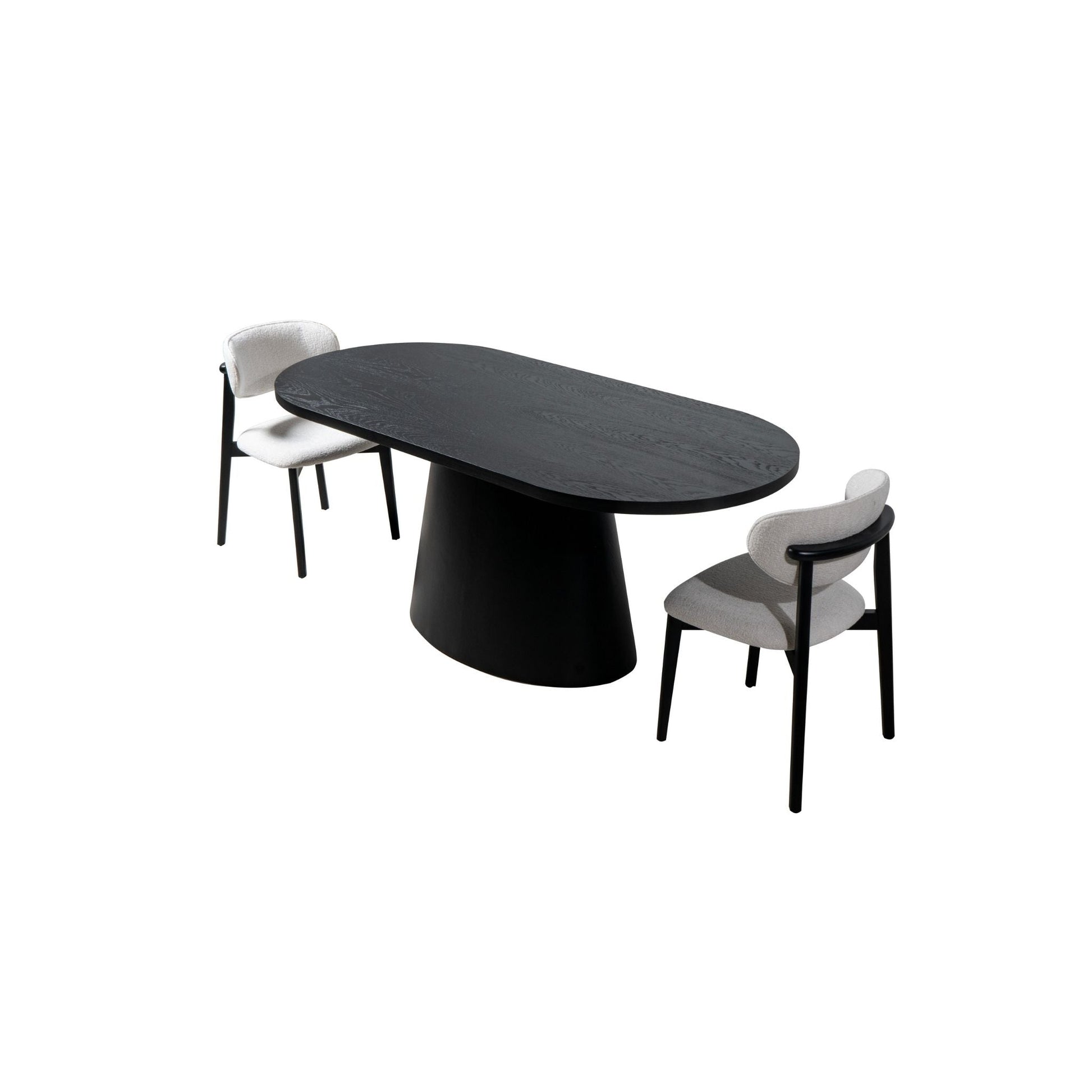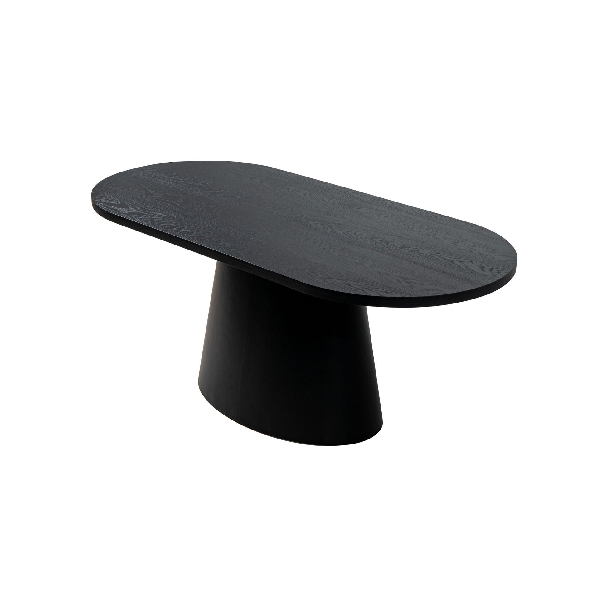 Die ovale Tischplatte in edler Holzdekor-Oberfläche ruht auf einem stabilen, konisch geformten Holzgestell und schafft eine harmonische Kombination aus Natürlichkeit und Design.