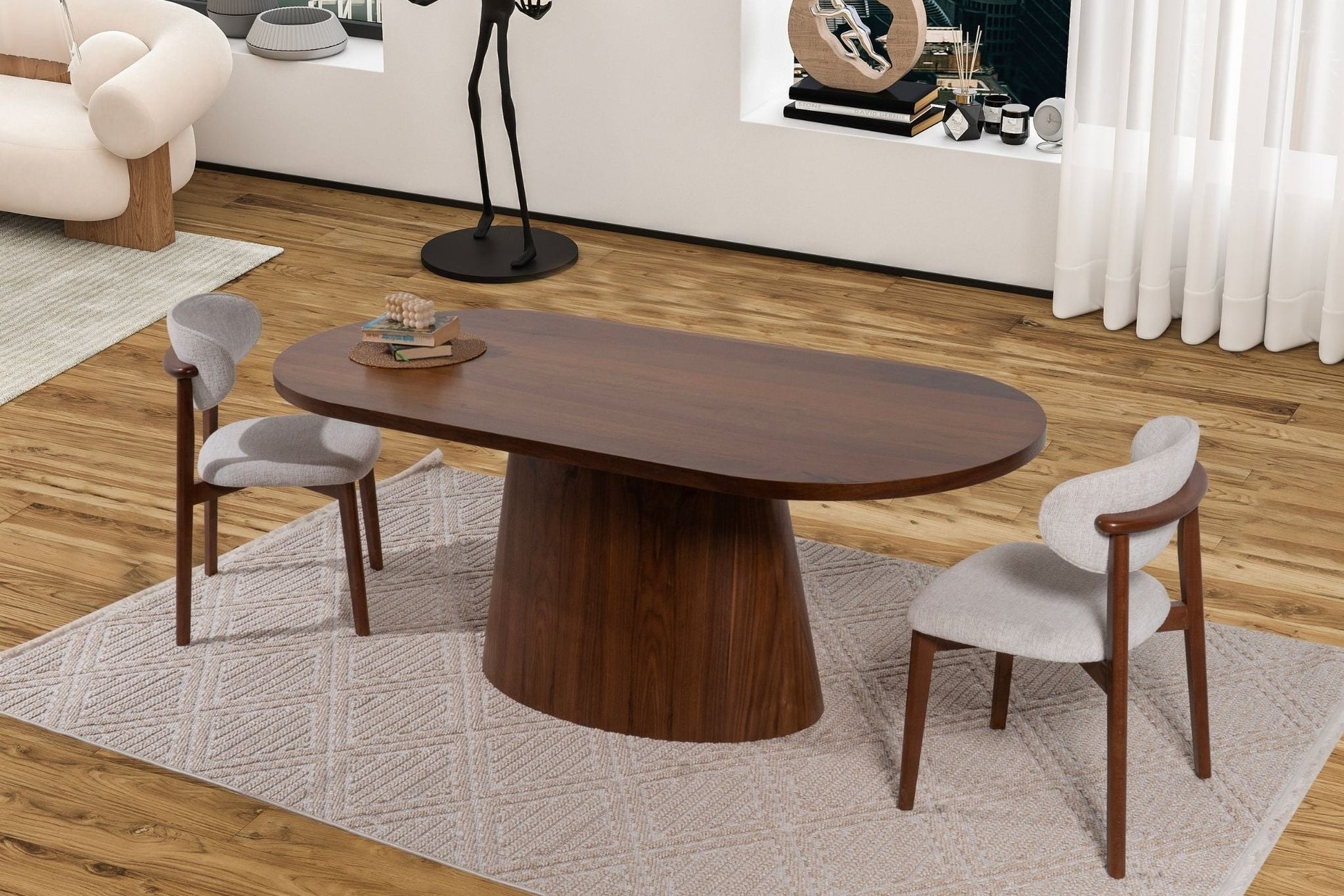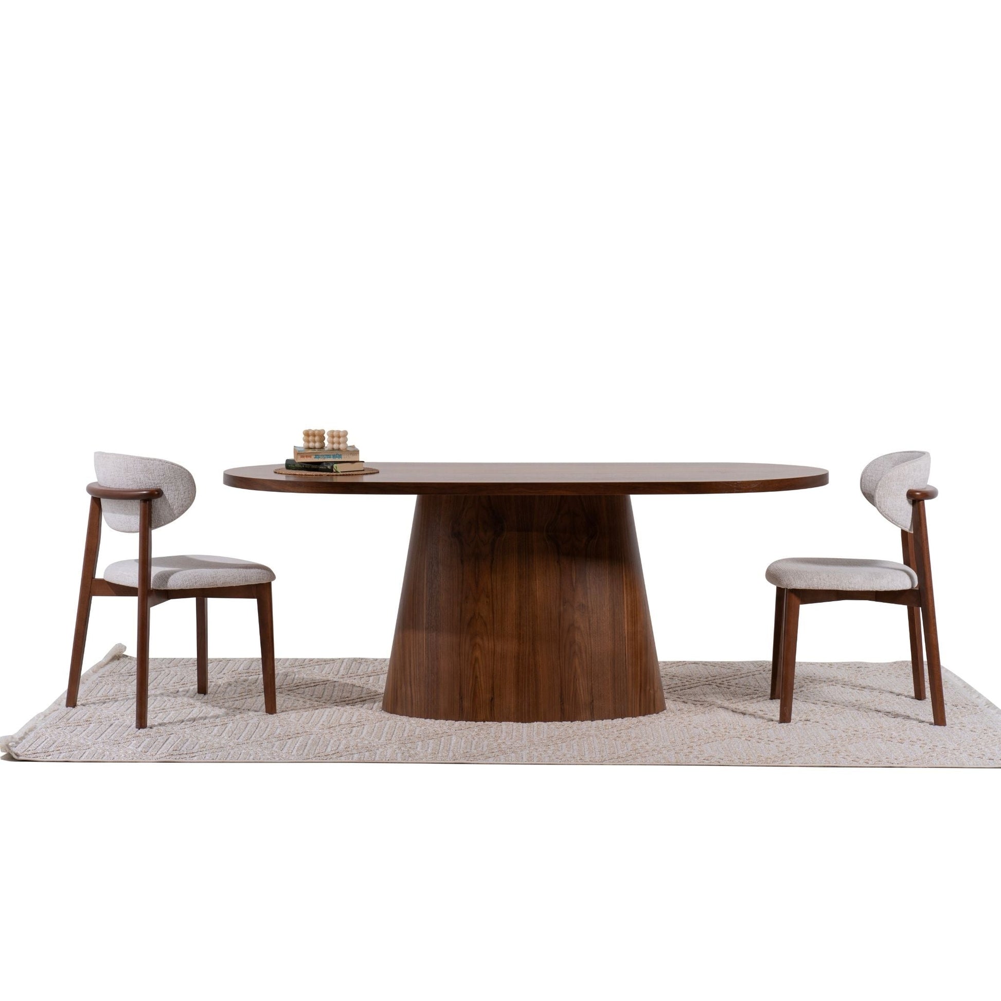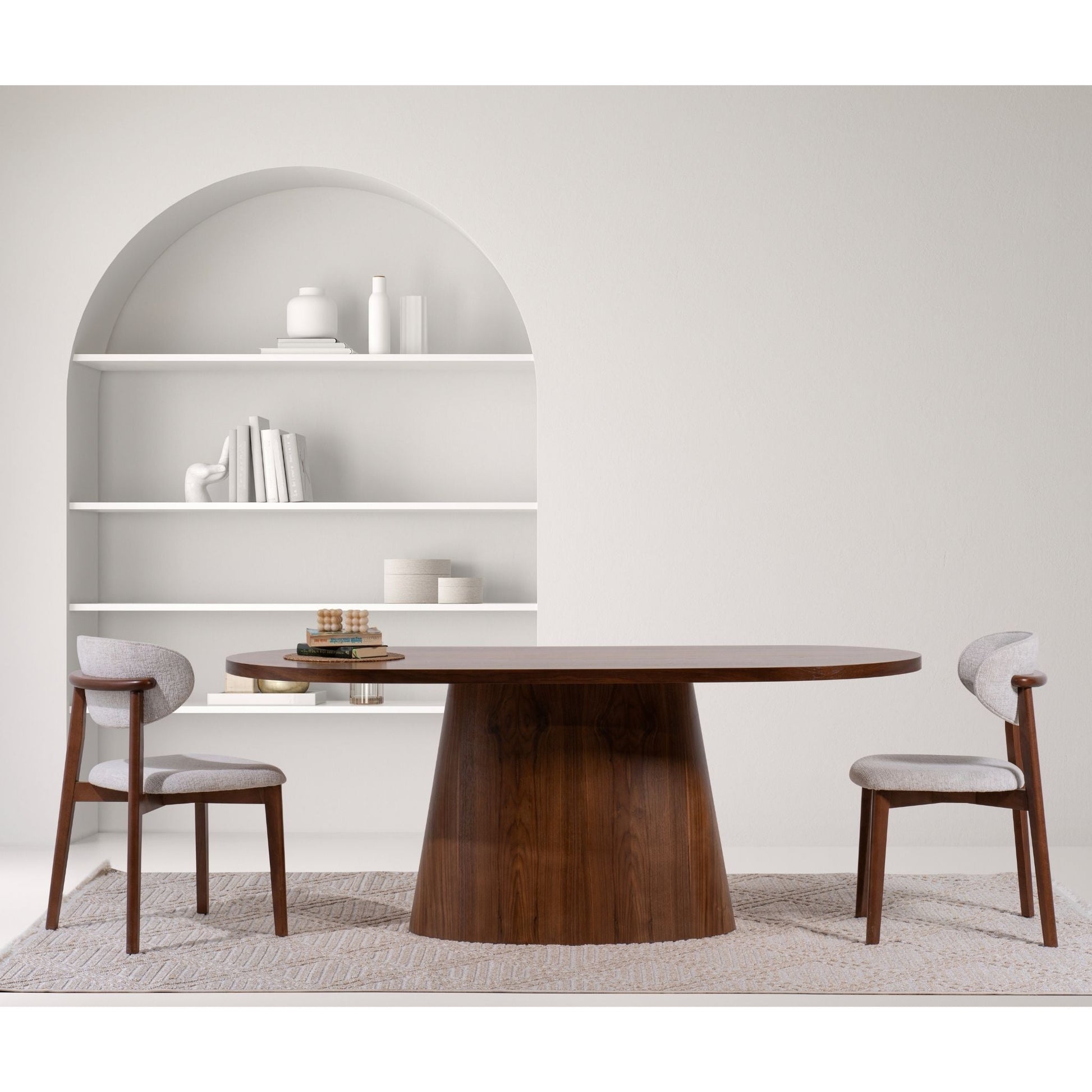 Die ovale Tischplatte mit edlem Walnuss-Holzdekor verleiht dem Tisch eine warme, elegante Ausstrahlung, während das konische Holzgestell für Stabilität und Stilbewusstsein sorgt.