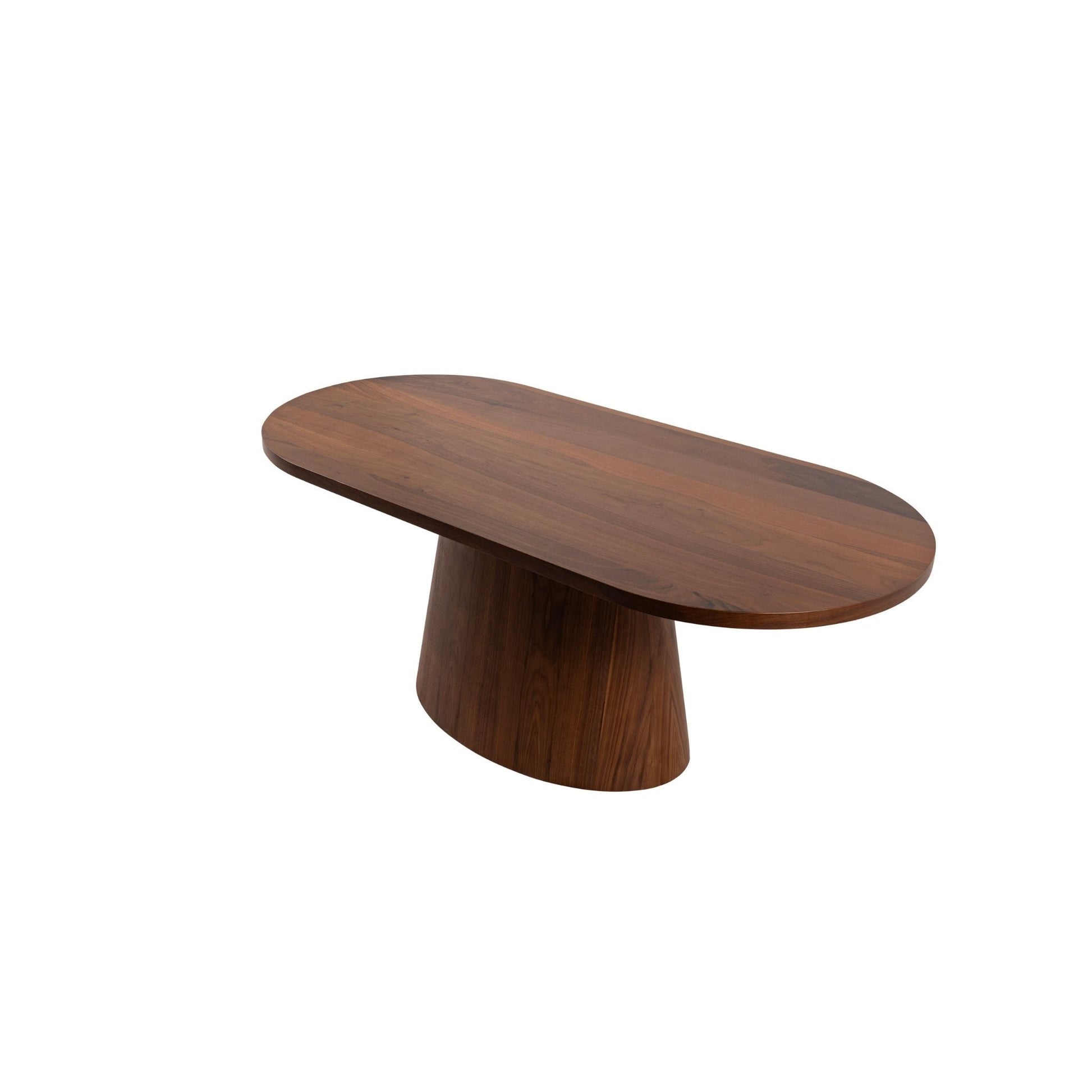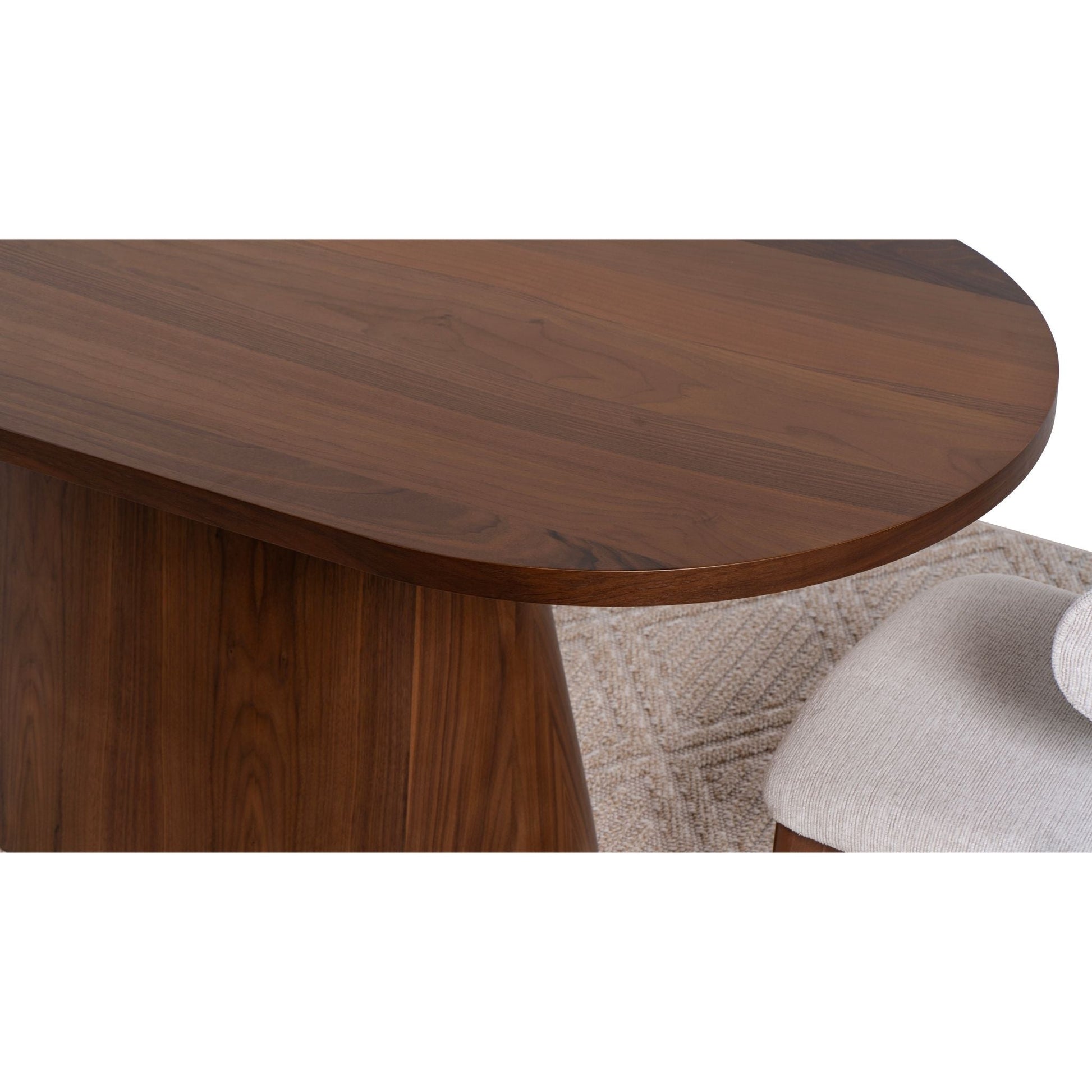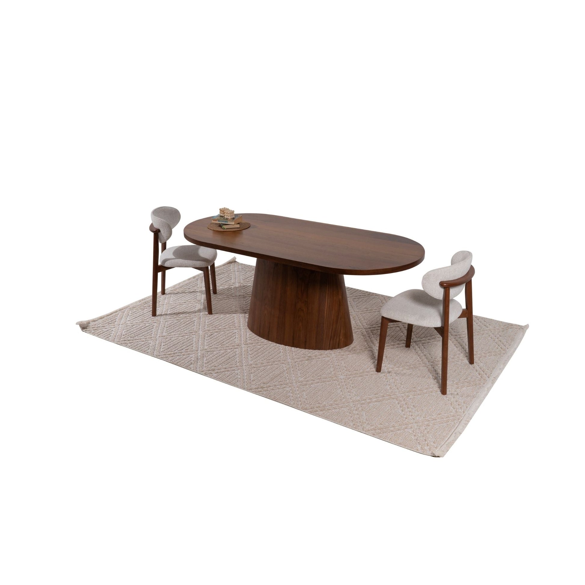 Die ovale Tischplatte mit edlem Walnuss-Holzdekor verleiht dem Tisch eine warme, elegante Ausstrahlung, während das konische Holzgestell für Stabilität und Stilbewusstsein sorgt.