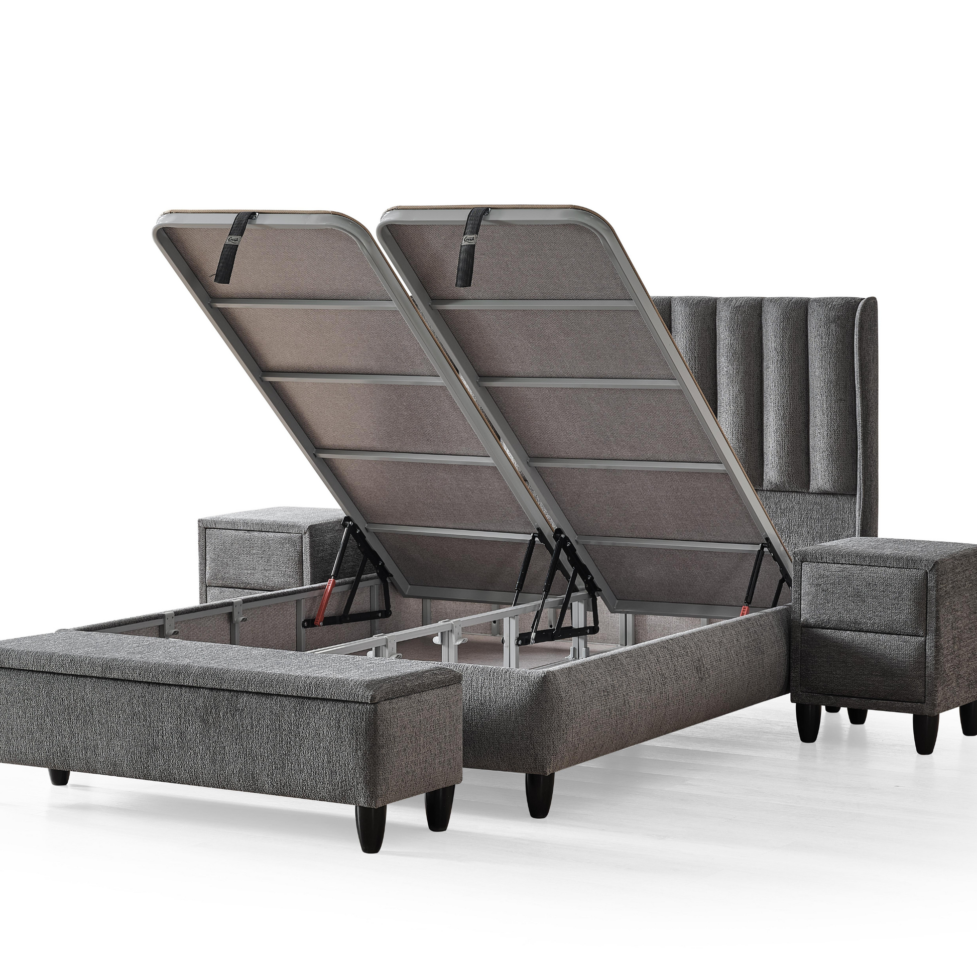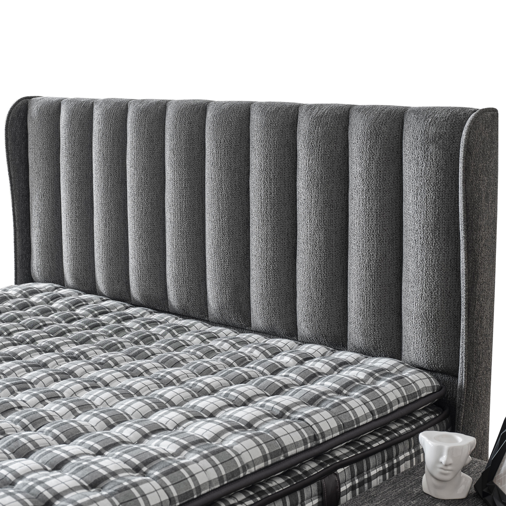 Der Bettkasten bietet großzügigen Stauraum dank einer stabilen Metallkastenkonstruktion, die eine langlebige und robuste Basis für hohe Matratzen bietet. Der leicht zugängliche Klappmechanismus ermöglicht Ihnen eine einfache Nutzung des Stauraums, perfekt für Decken, Kissen und andere Schlafzimmerutensilien.