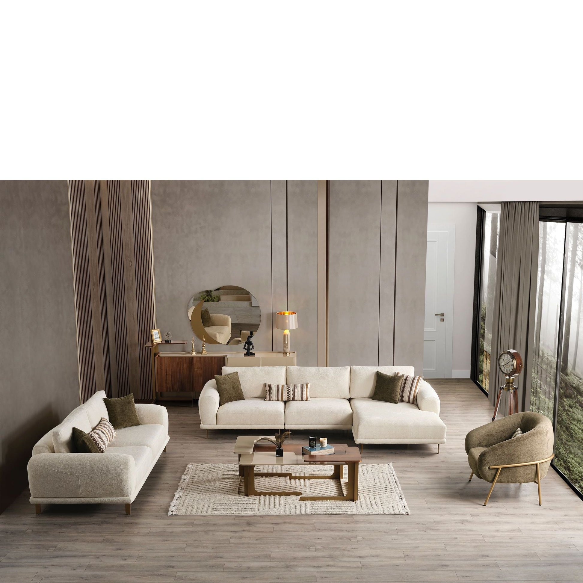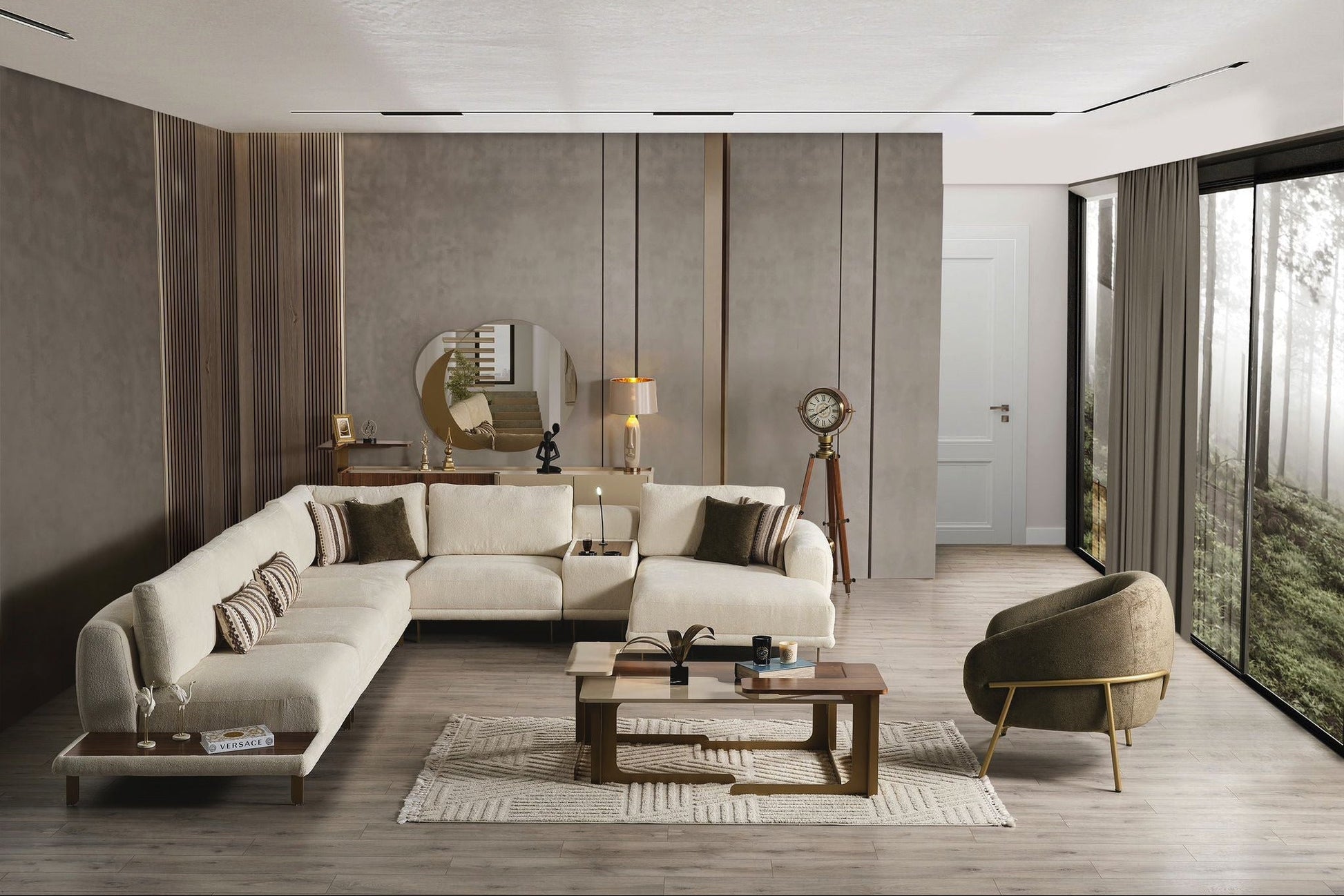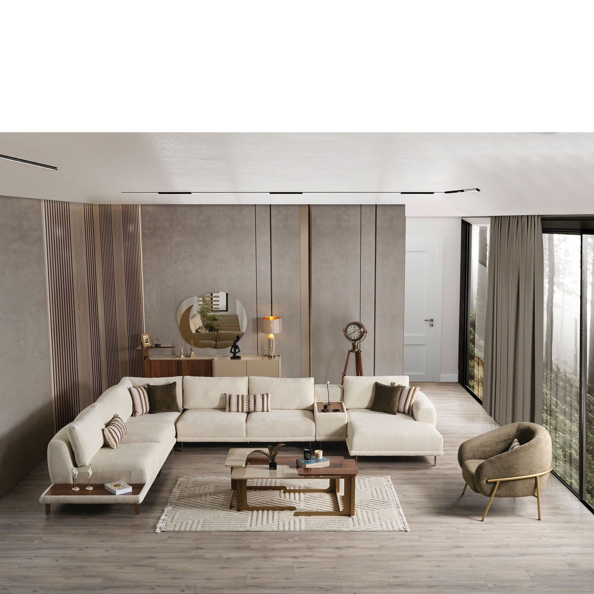 Mit seiner klaren Linienführung, den sanften Beigetönen und den fein abgestimmten Holzakzenten fügt es sich harmonisch in jedes moderne Wohnzimmer ein.