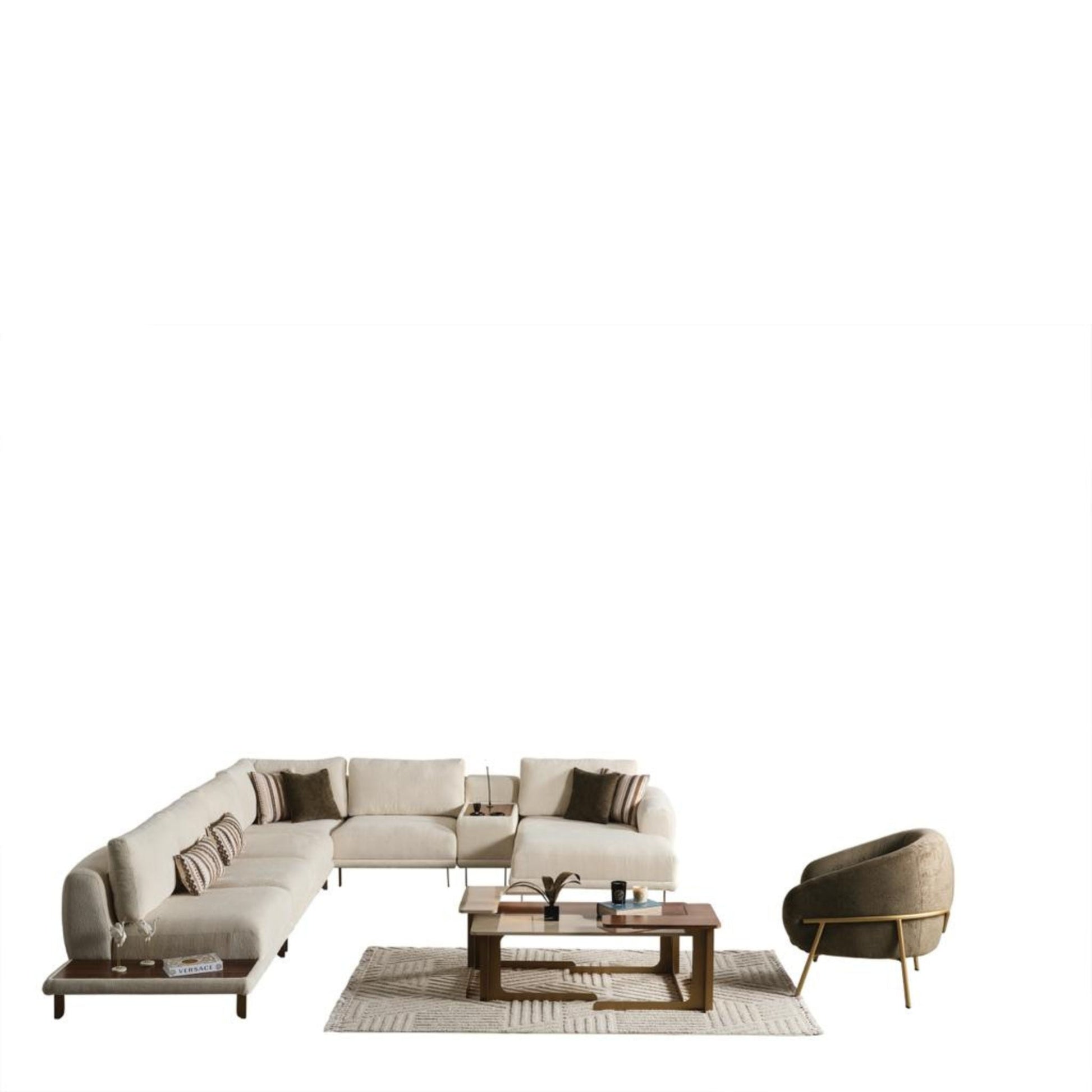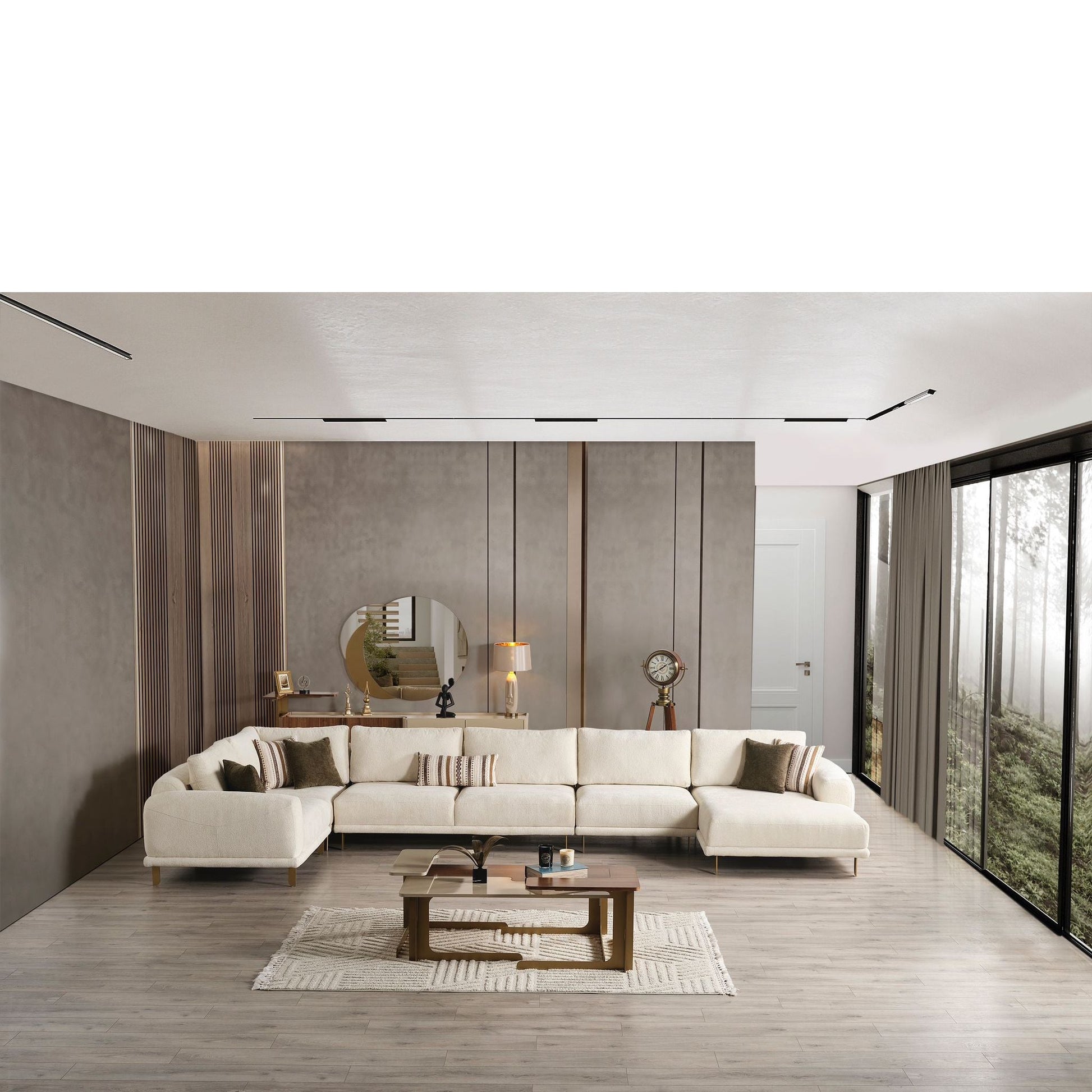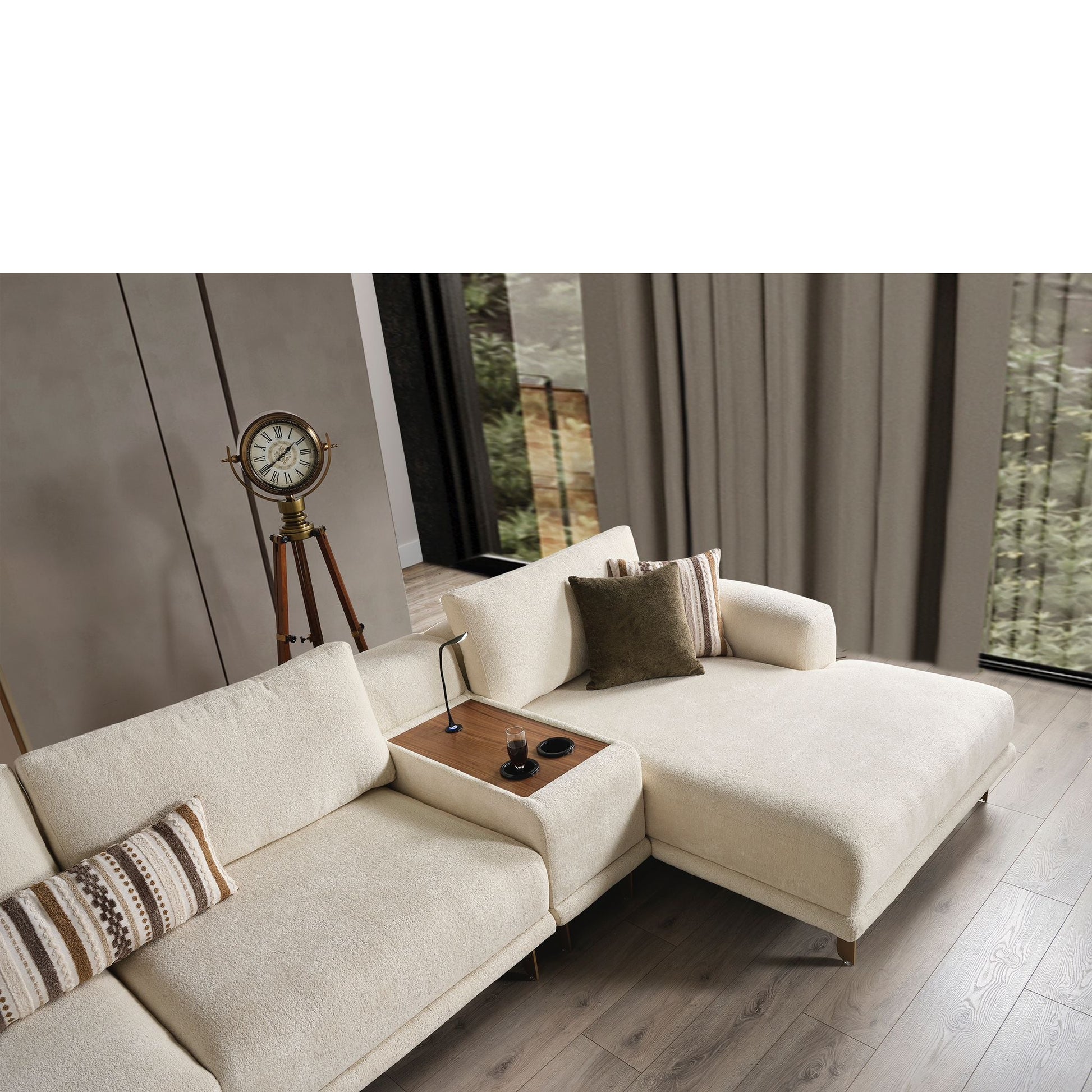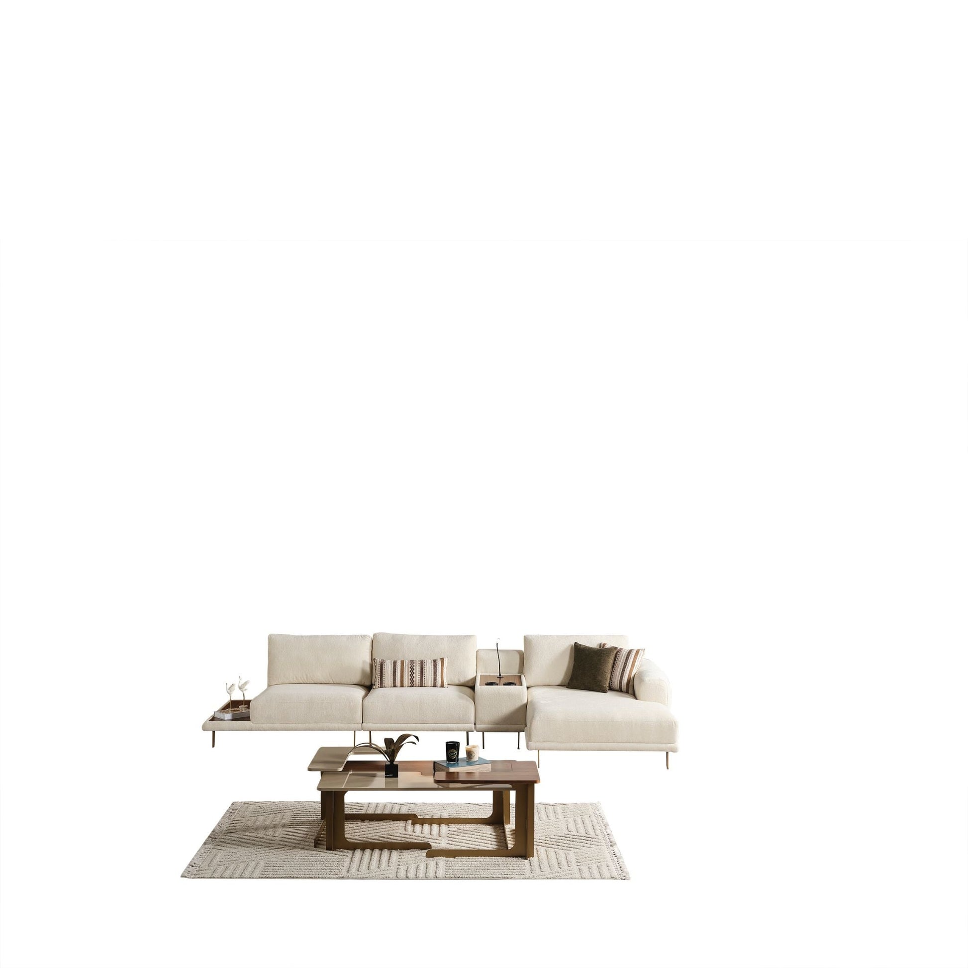 Mit seiner klaren Linienführung, den sanften Beigetönen und den fein abgestimmten Holzakzenten fügt es sich harmonisch in jedes moderne Wohnzimmer ein.