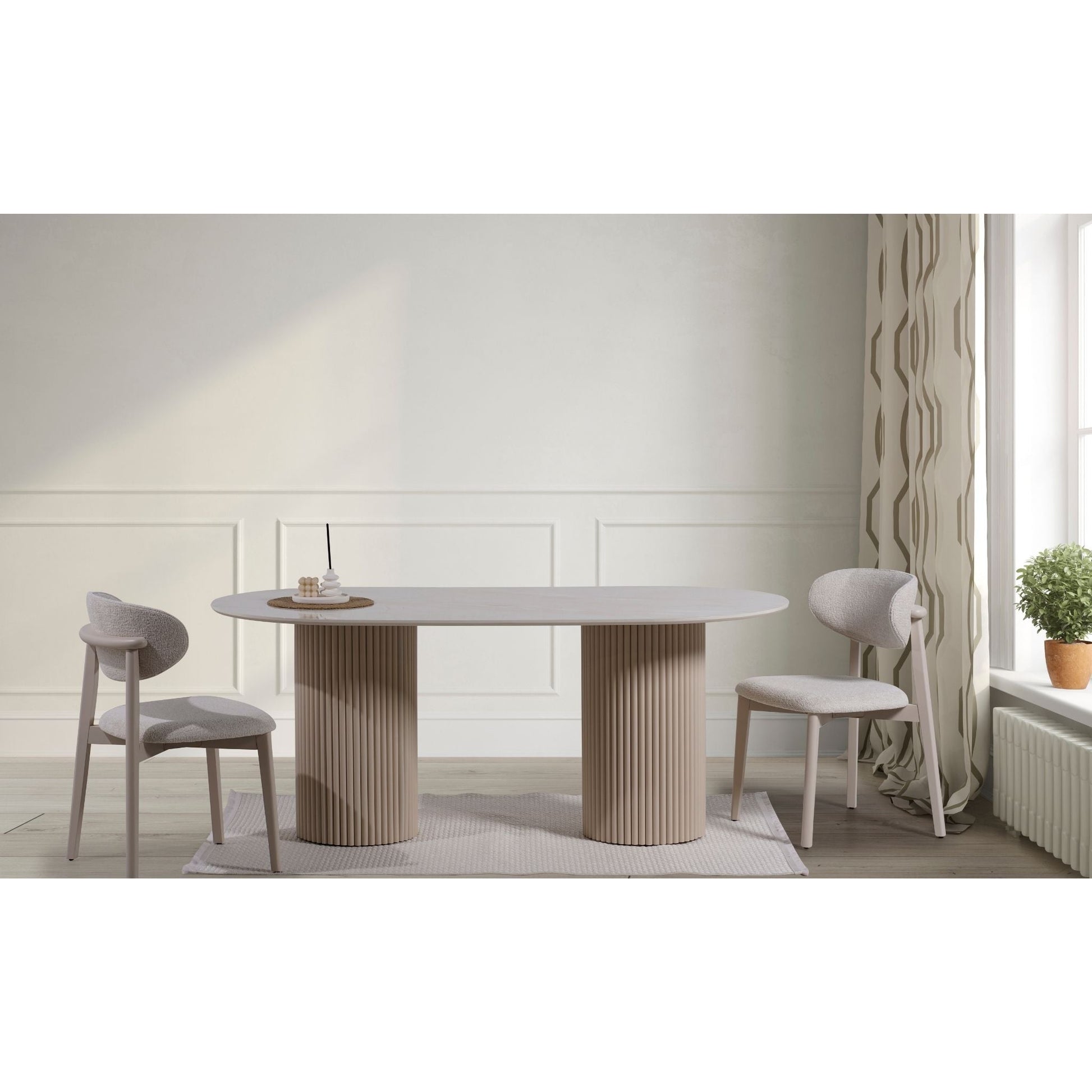 Der Pirinta Esstisch kombiniert warme Holzoptik mit moderner Formensprache.