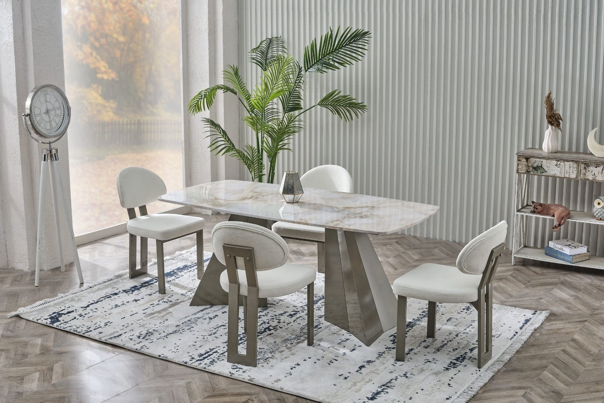 Diese hellere Variante des Pramid Mermerit Esstisch-Sets bringt mit ihrer sanften Farbgebung Leichtigkeit und Eleganz in den Raum – perfekt für offene Wohnbereiche mit modernem Charakter.