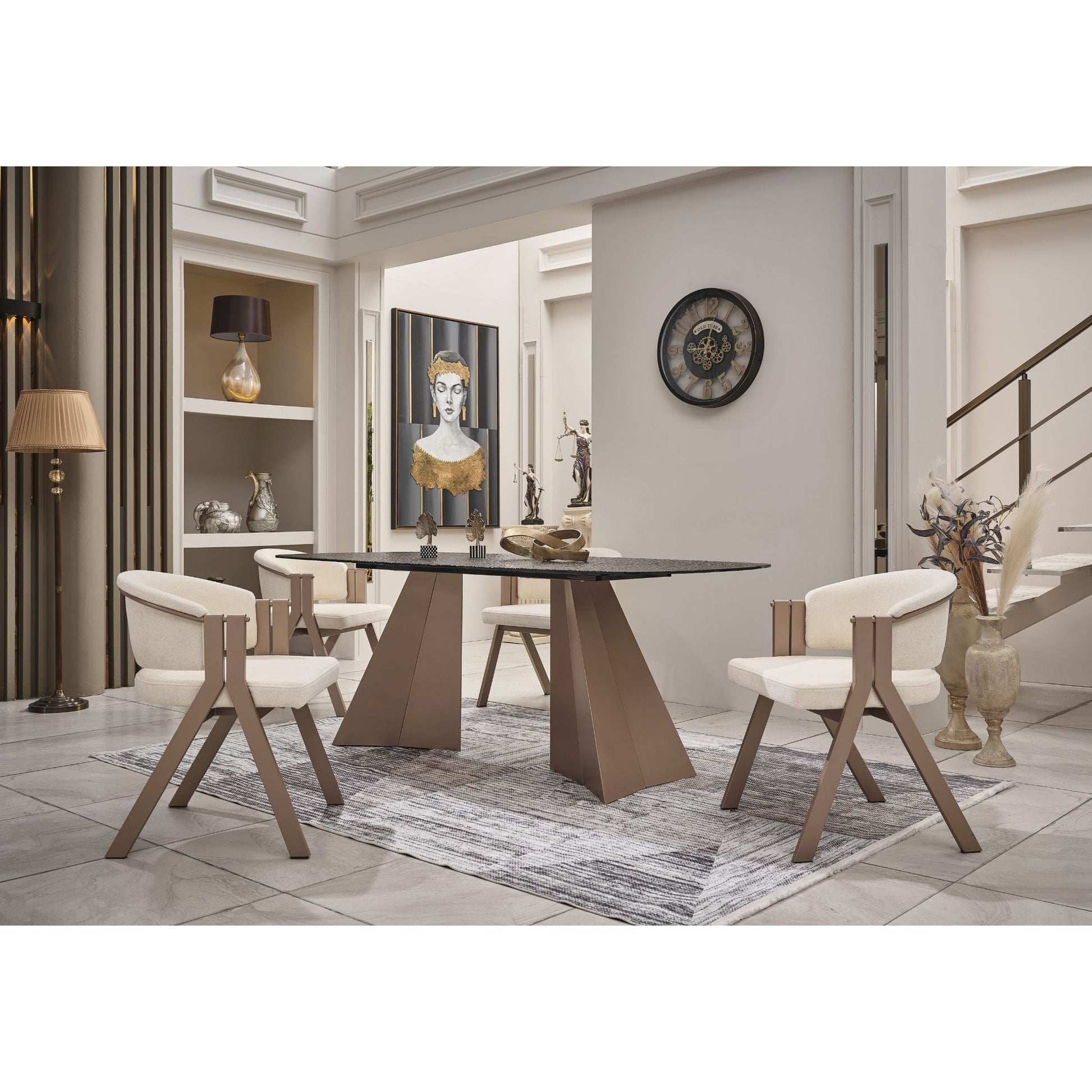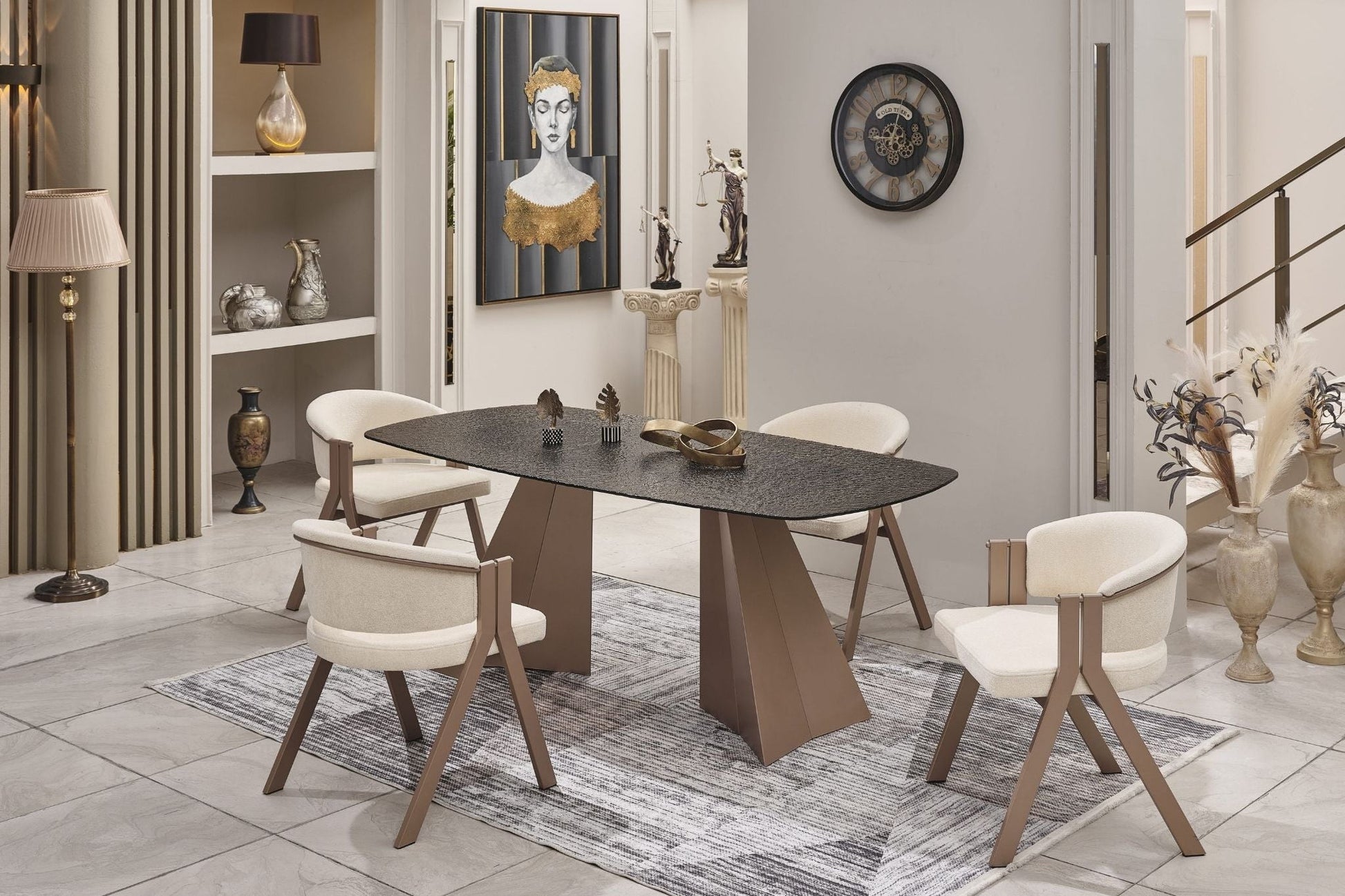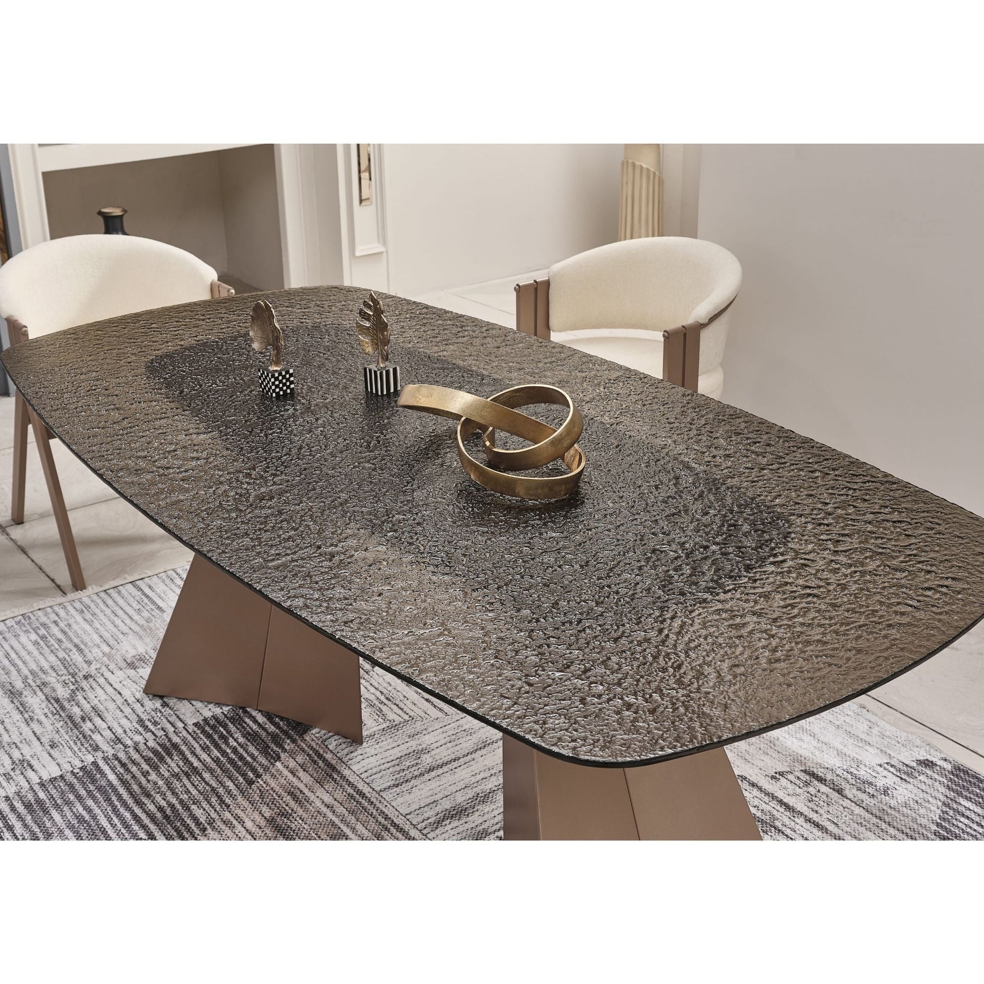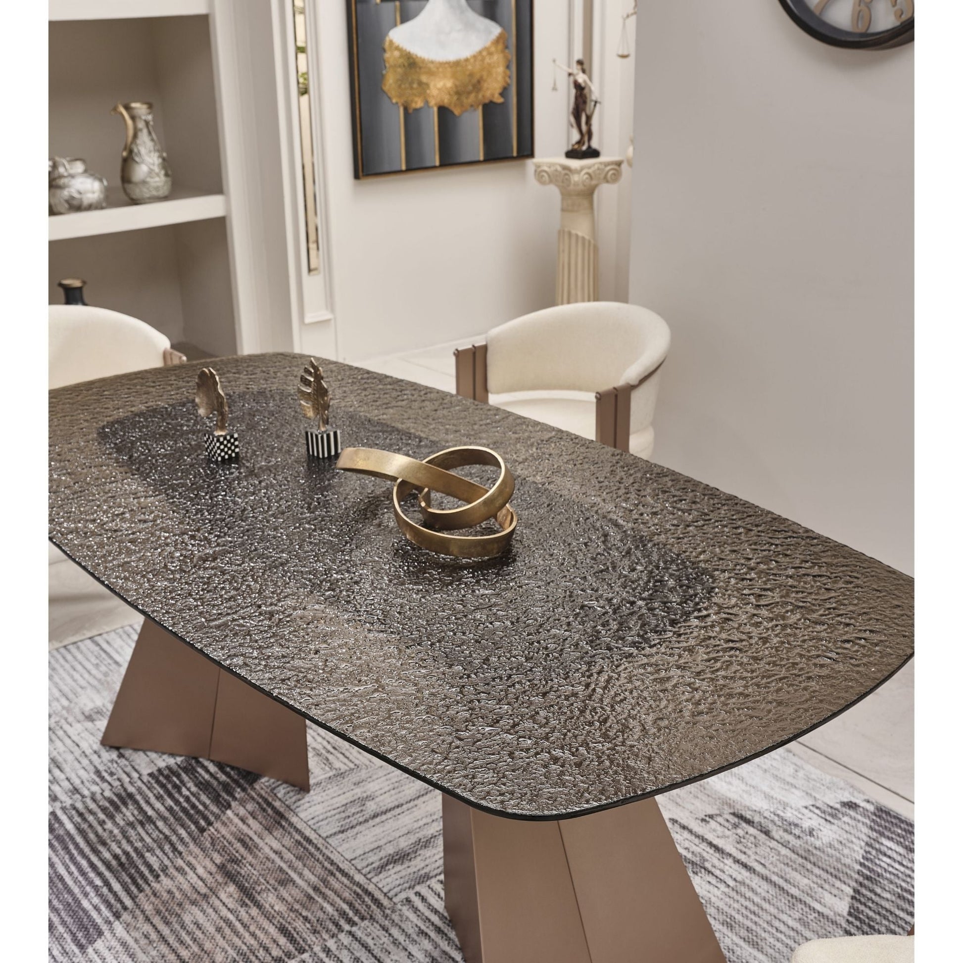Diese Bronze-Ausführung des Pramit Kristall Esstisch-Sets bringt Wärme und Eleganz in den Raum – ideal für alle, die ein harmonisches, luxuriöses Ambiente schaffen möchten.