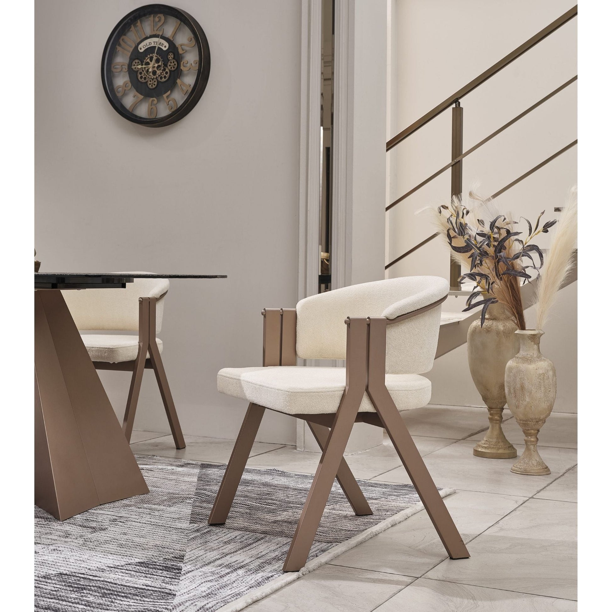 Die Roma-Stühle mit gepolstertem Sitz und Rückenlehne fügen sich mit ihrer geschwungenen Form perfekt in das Gesamtkonzept ein – sie bieten hohen Komfort und runden den eleganten Look harmonisch ab.