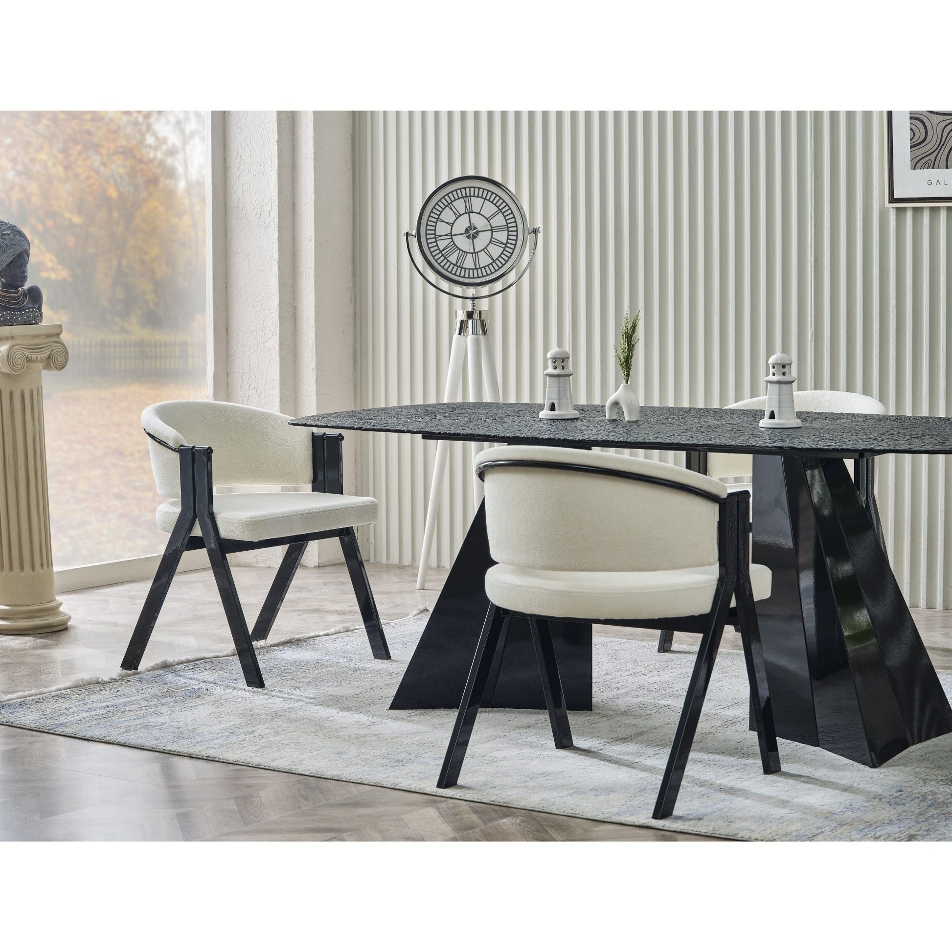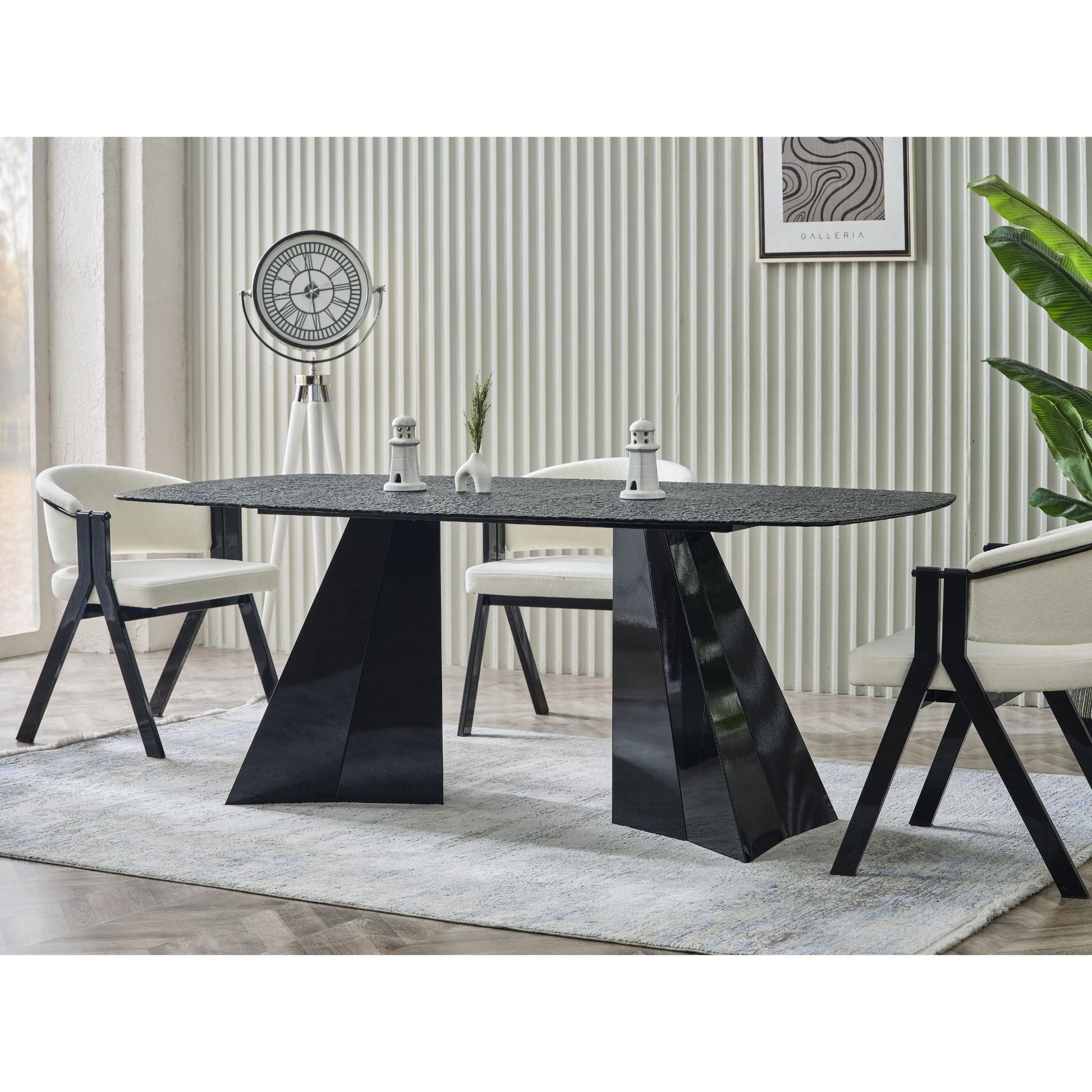 Das Pramit Kristall Esstisch-Set zeigt sich hier in seiner edelsten Ausführung: mit einer tiefschwarzen, strukturierten Kristallglasplatte, die Licht und Schatten auf elegante Weise einfängt.