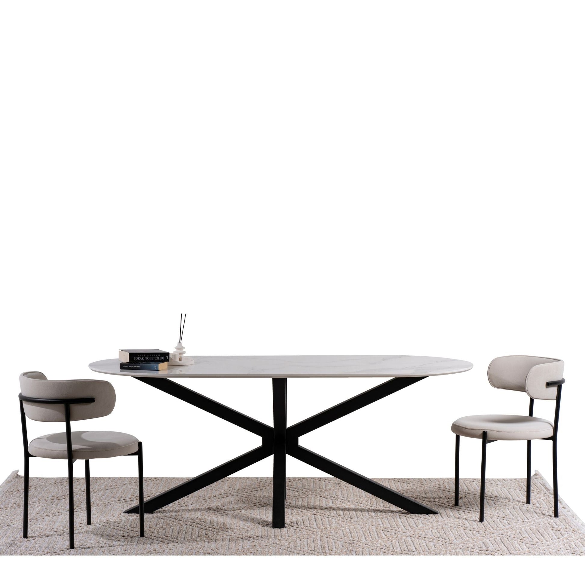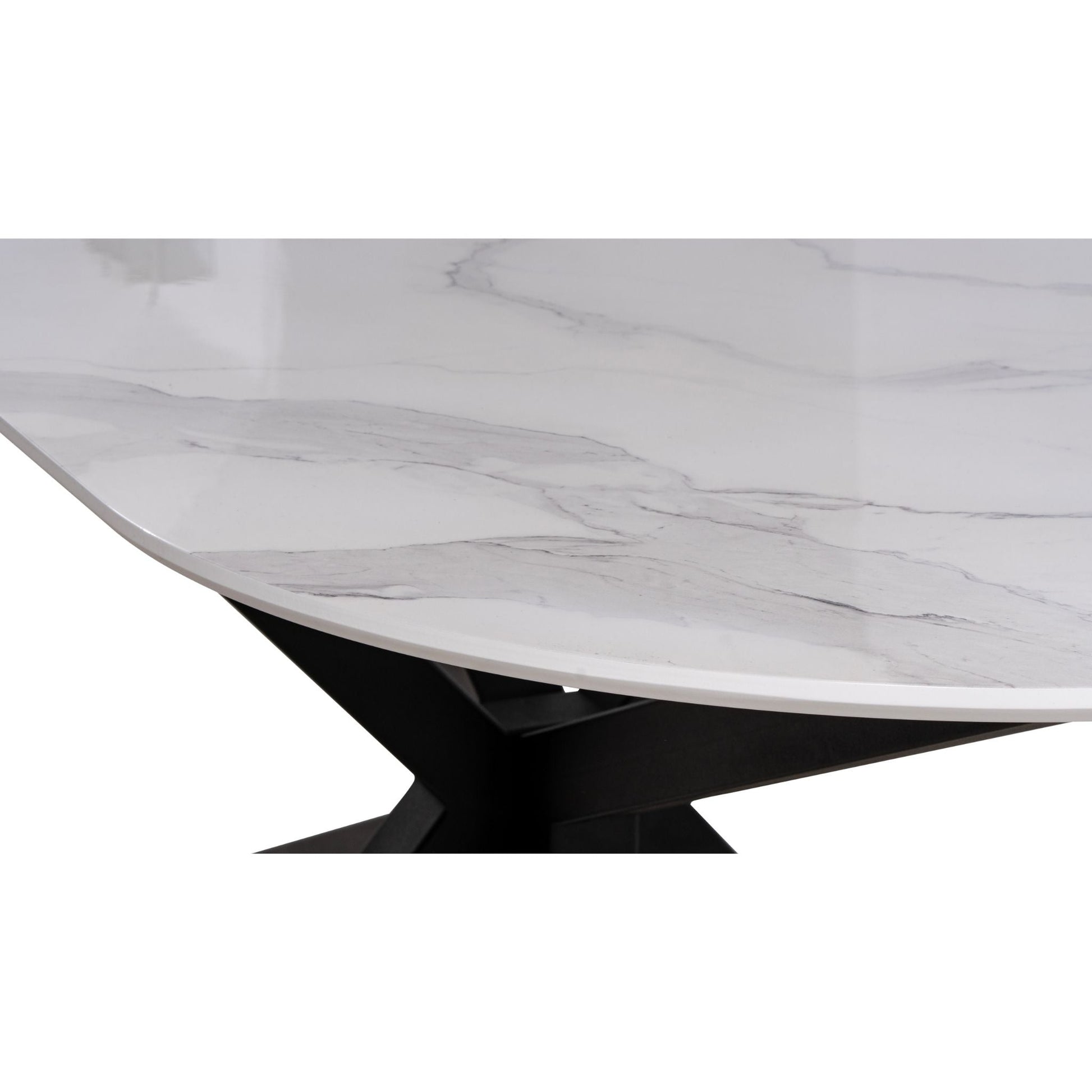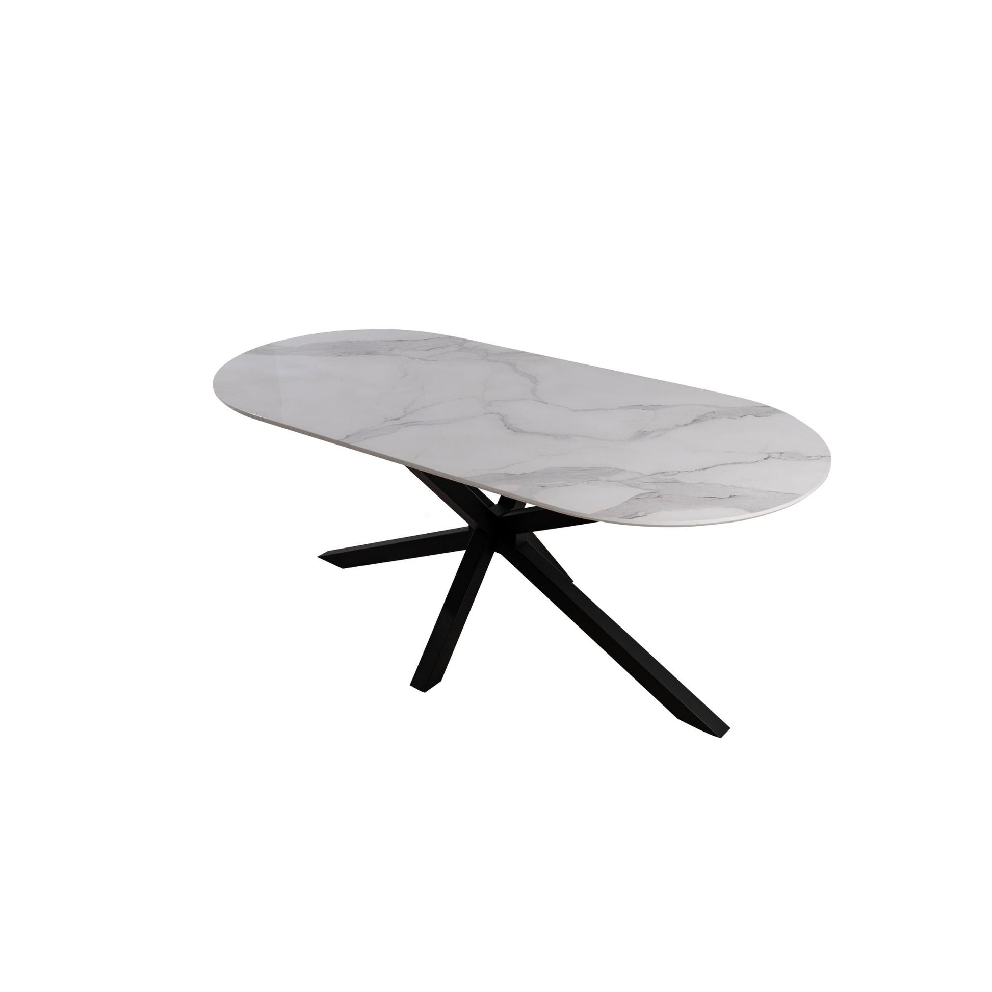 Die ovale Tischplatte mit digital bedruckter Oberfläche besticht durch ihre realistische Marmoroptik und eine glatte, pflegeleichte Struktur.