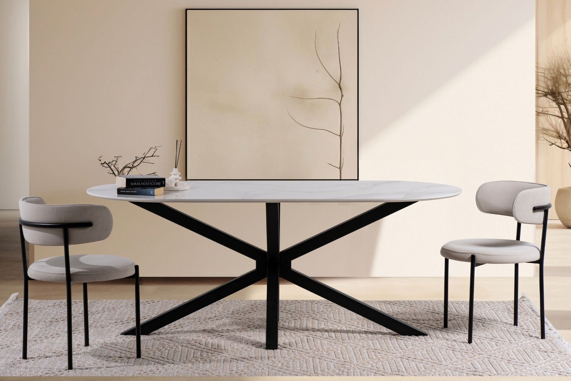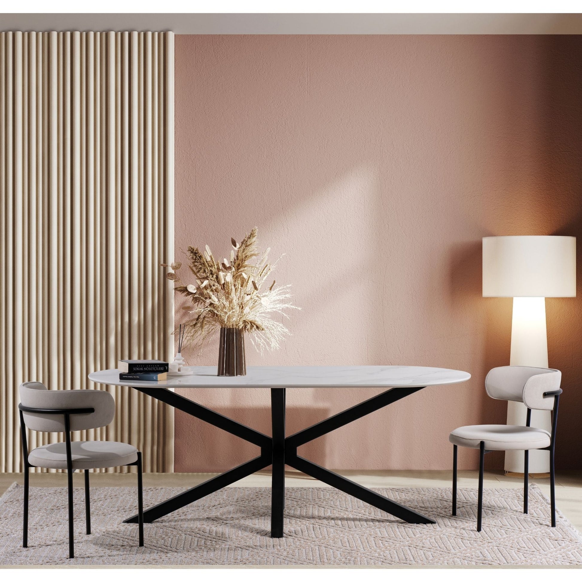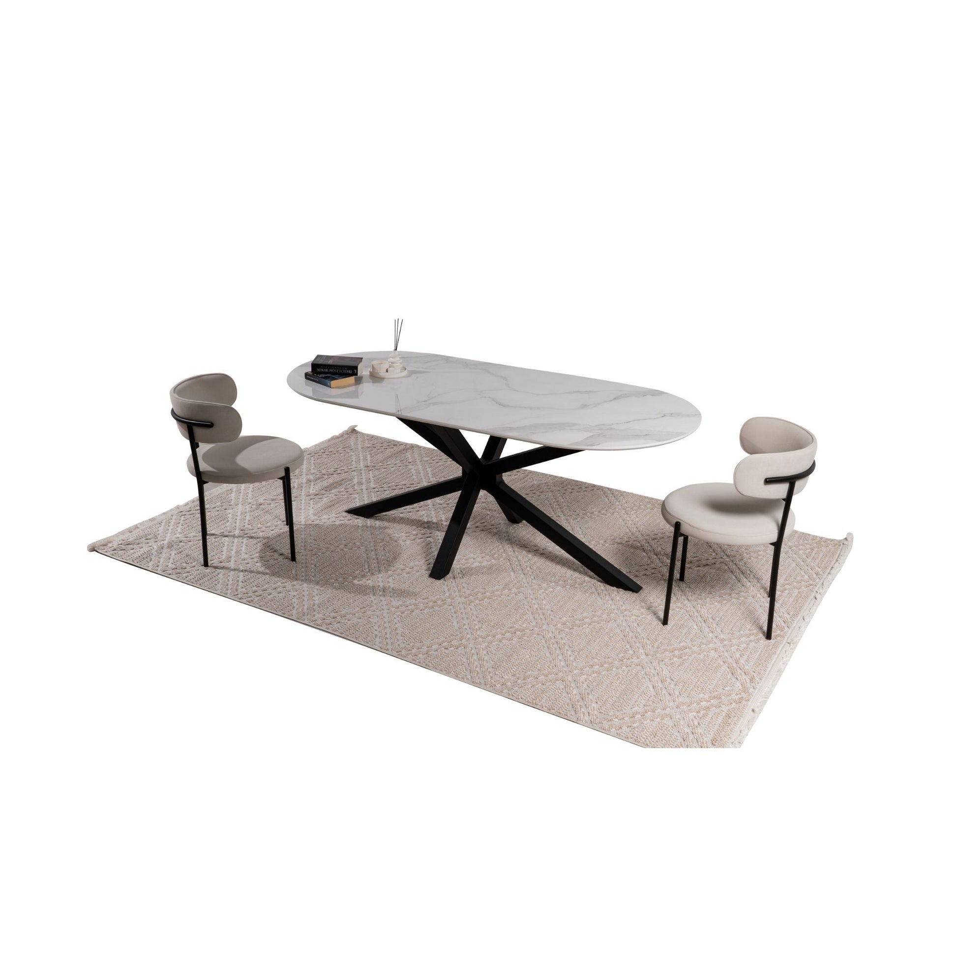 Die ovale Tischplatte mit digital bedruckter Oberfläche besticht durch ihre realistische Marmoroptik und eine glatte, pflegeleichte Struktur.