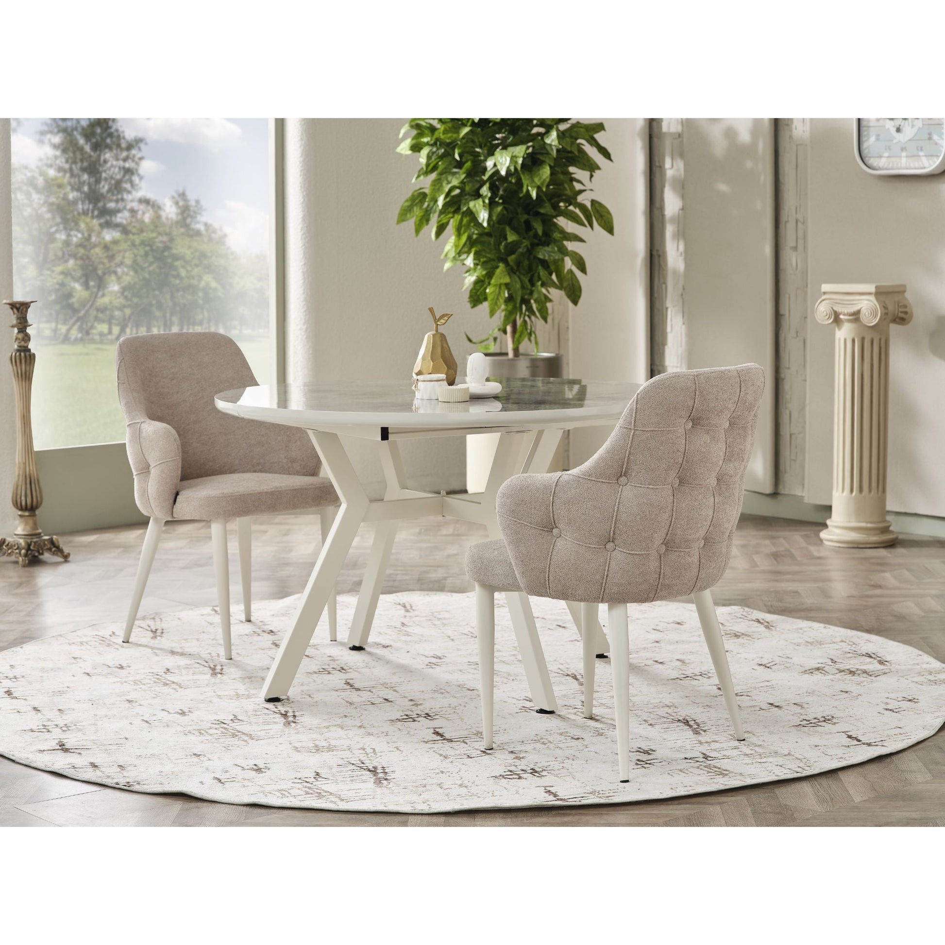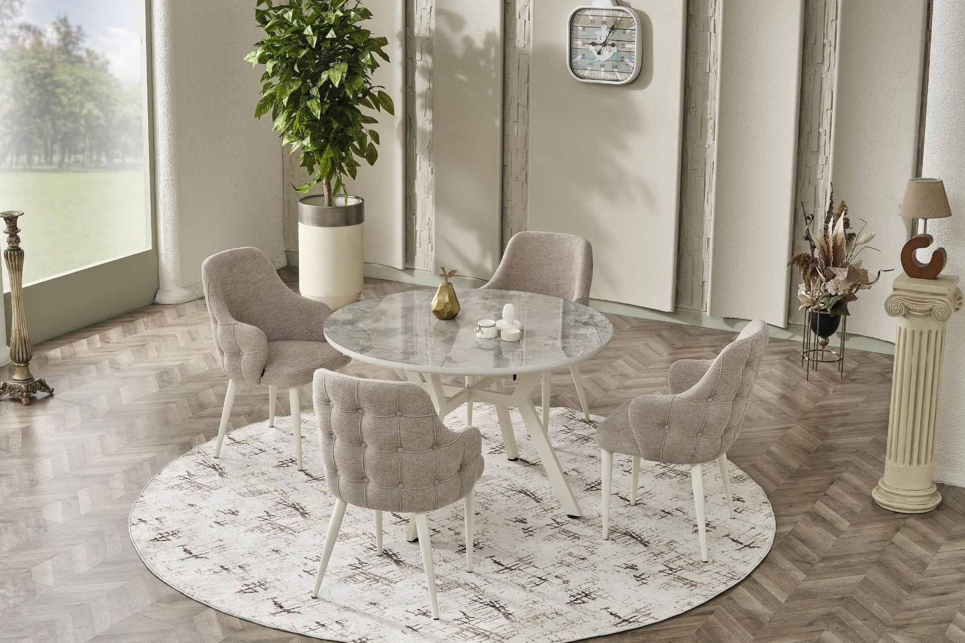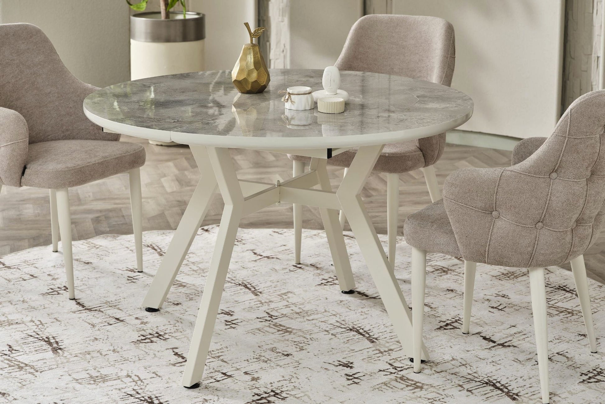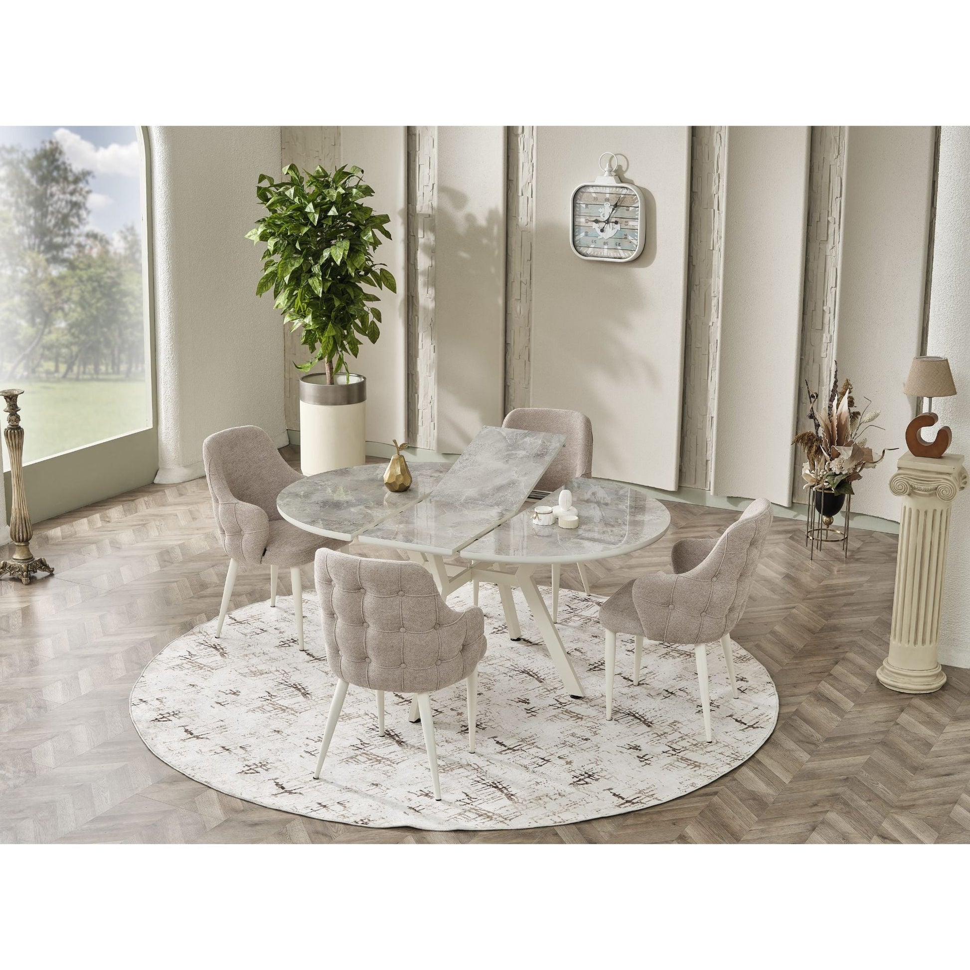 Der runde Tisch mit ausziehbarer Platte bietet genügend Platz für Familie und Gäste, während die Alfa Stühle mit ihrem gepolsterten Sitzbereich und Metallgestell für Komfort und Stabilität sorgen.