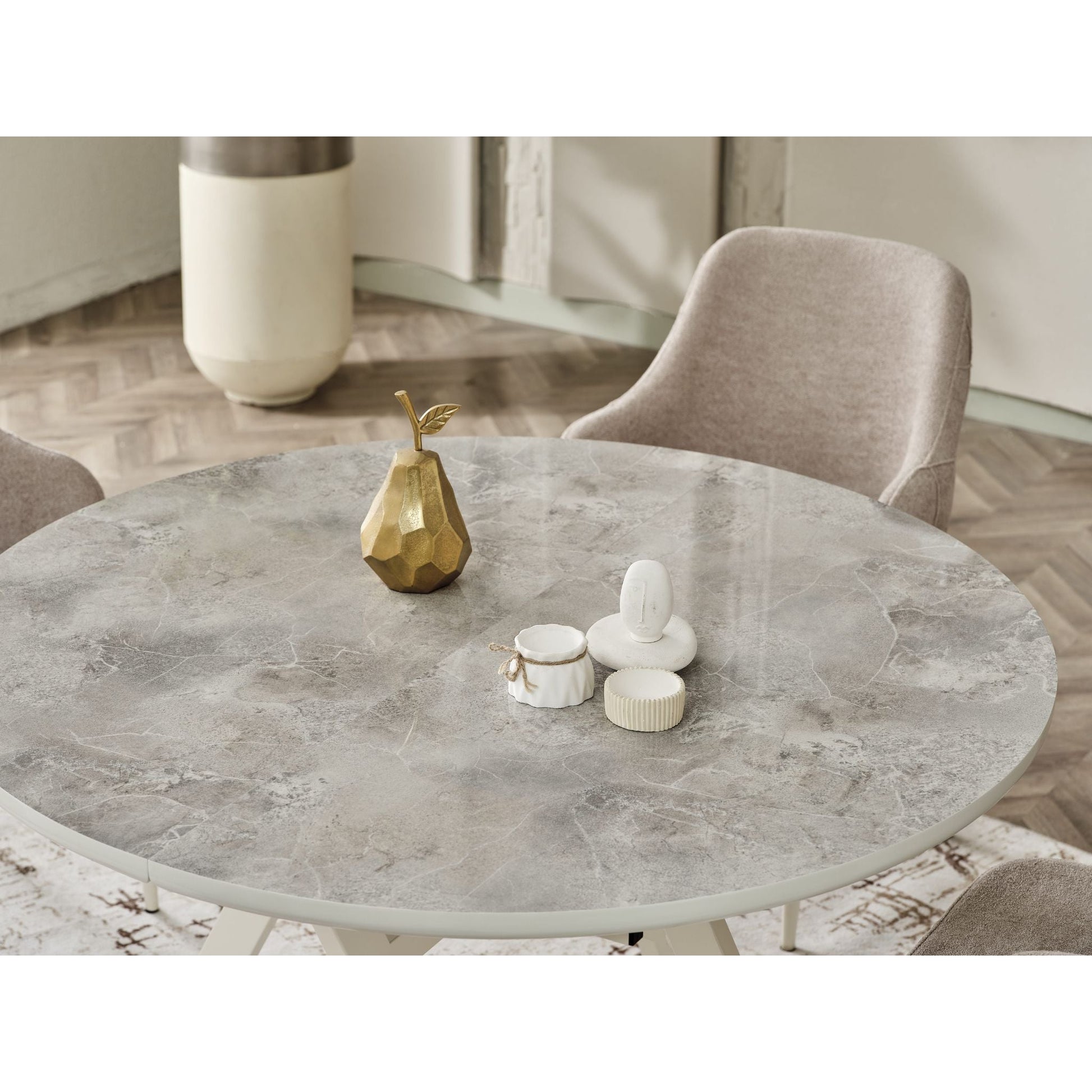 Mit seiner runden, ausziehbaren Form und den komfortablen Stühlen bietet es eine perfekte Lösung für stilbewusste Essbereiche – modern, flexibel und langlebig.